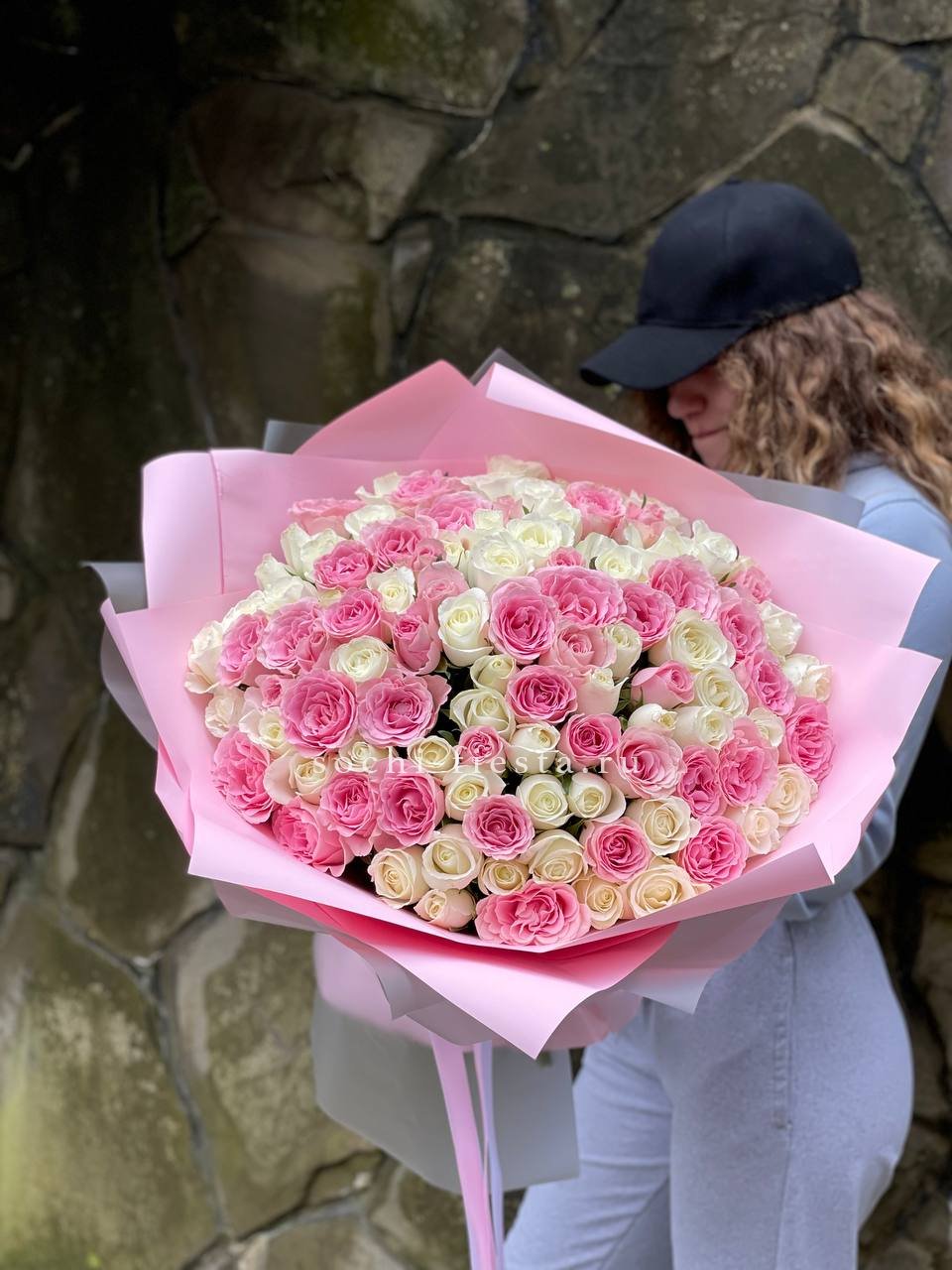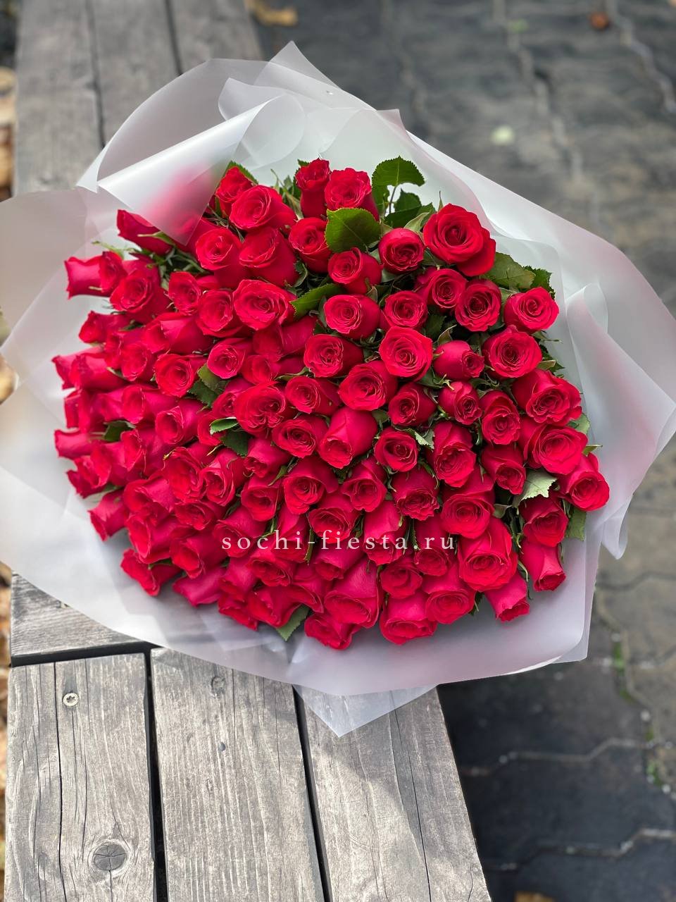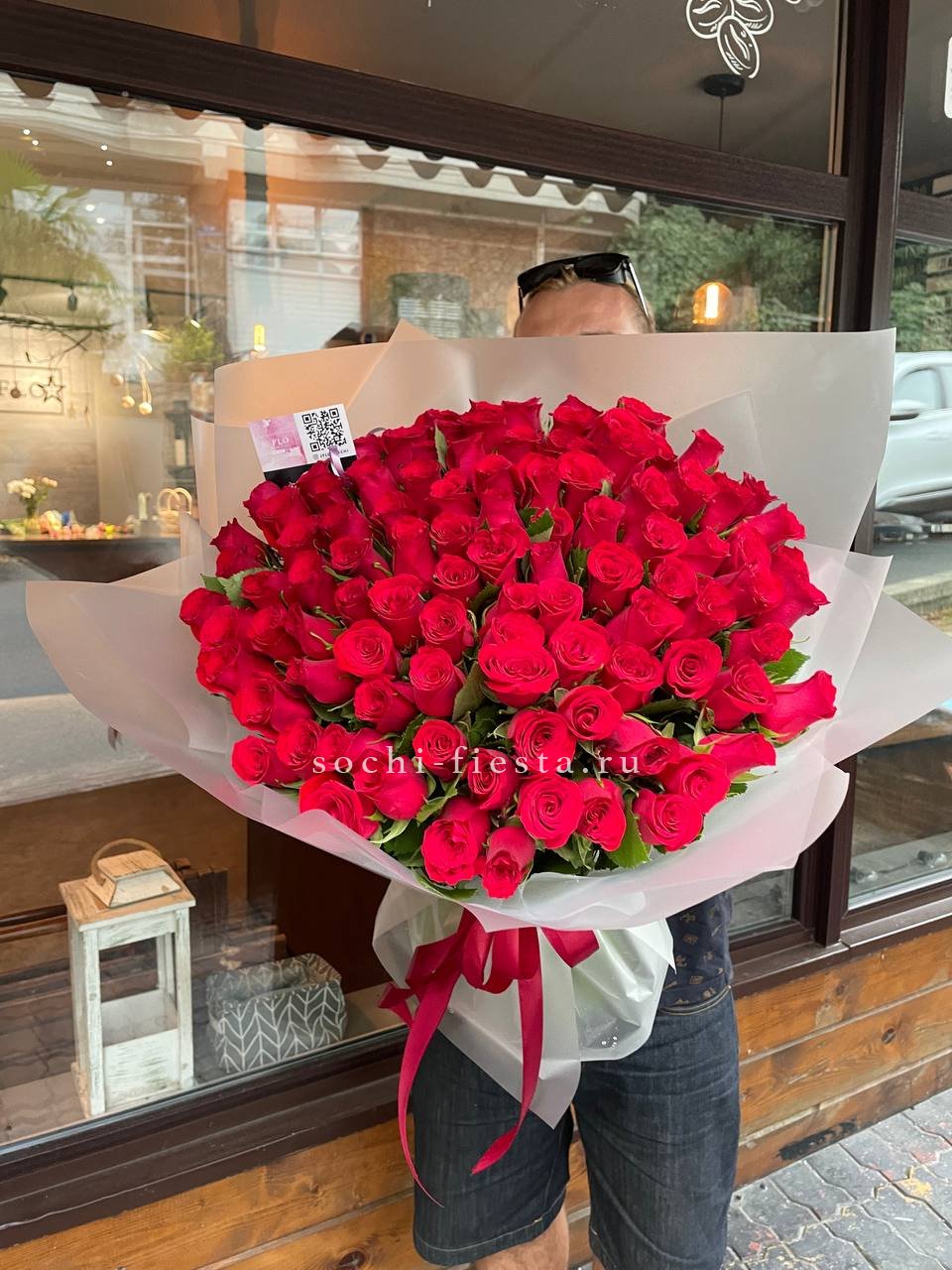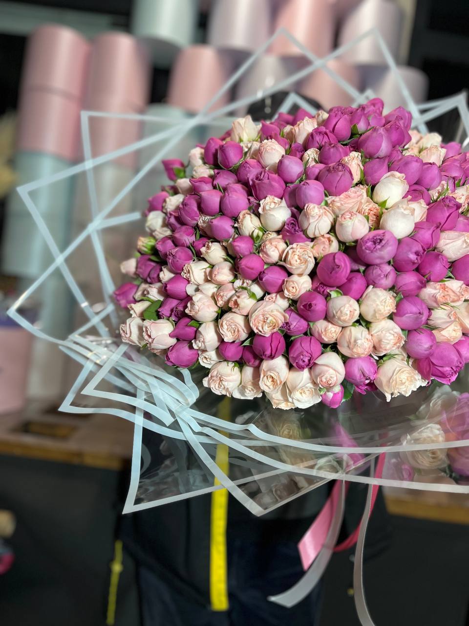 101 кустовая пионовидная роза, лента, дизайнерская упаковка.