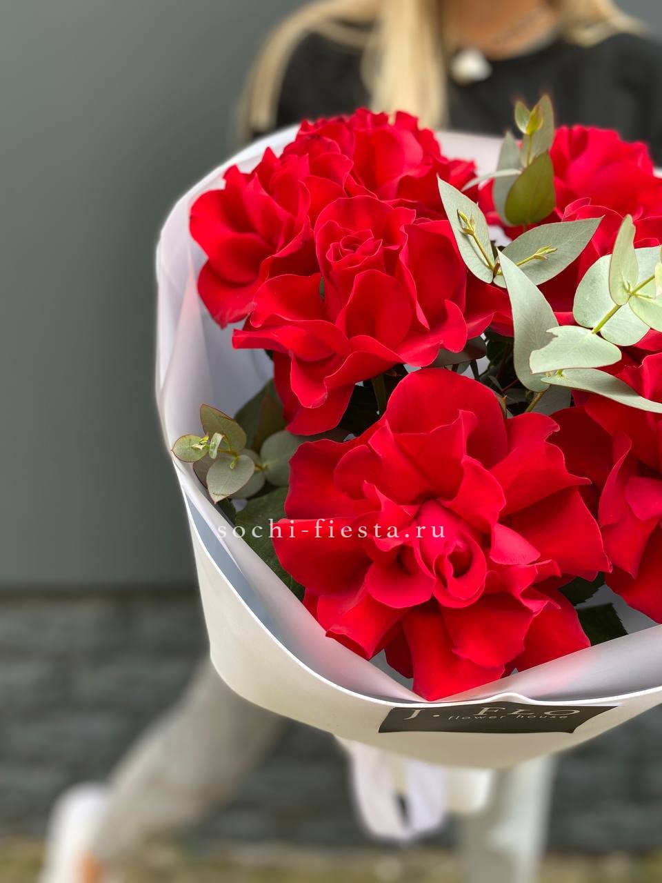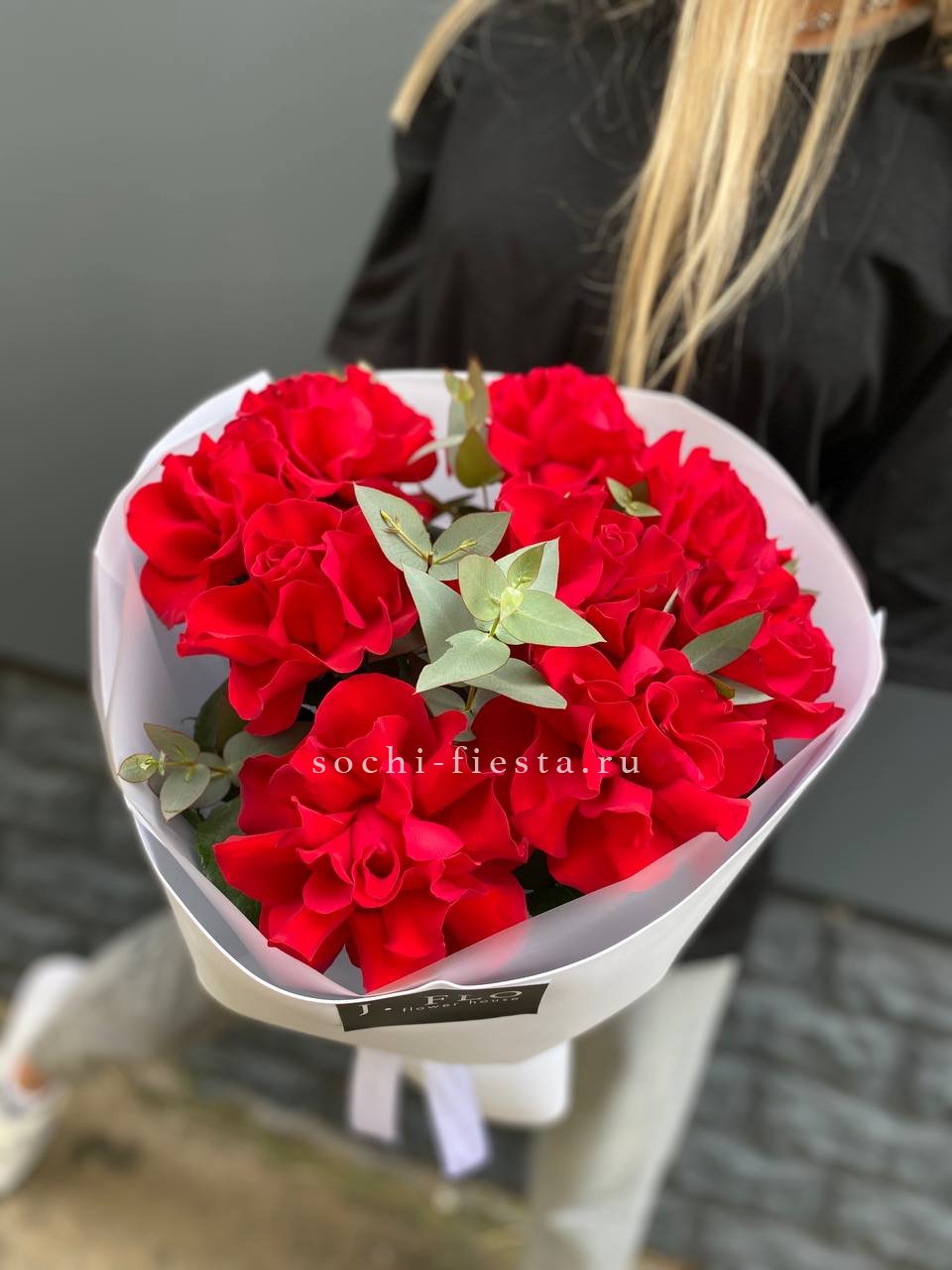 Тридцать один бутон насыщенного красного оттенка собраны в плотную композицию. Упаковка мягко обрамляет цветы, сохраняя естественную форму и позволяя каждому бутону раскрыться в своем ритме.