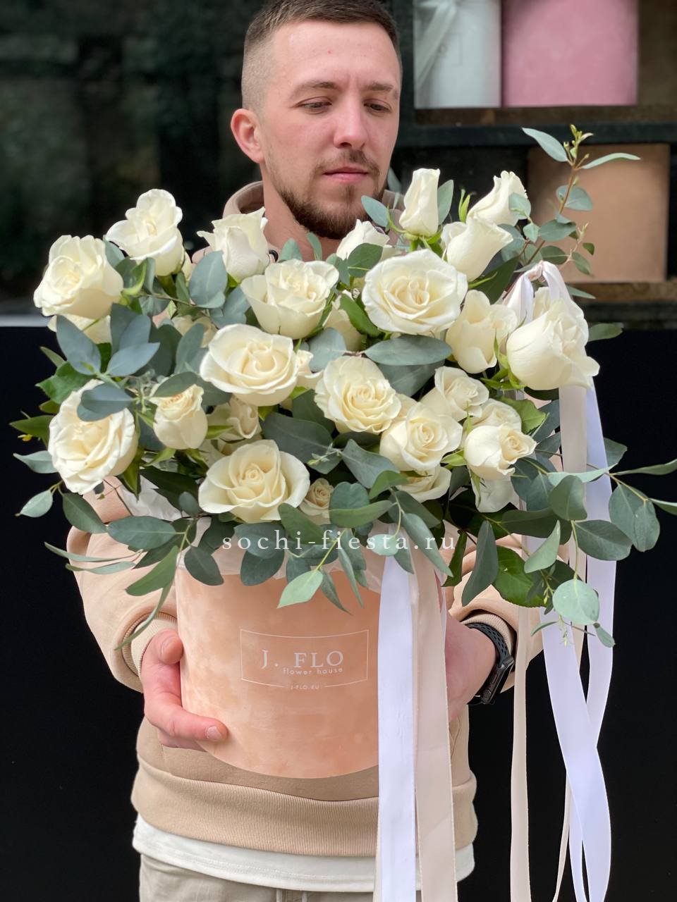 белые розы, цилиндр D20, эвкалипт, лента, упаковка.