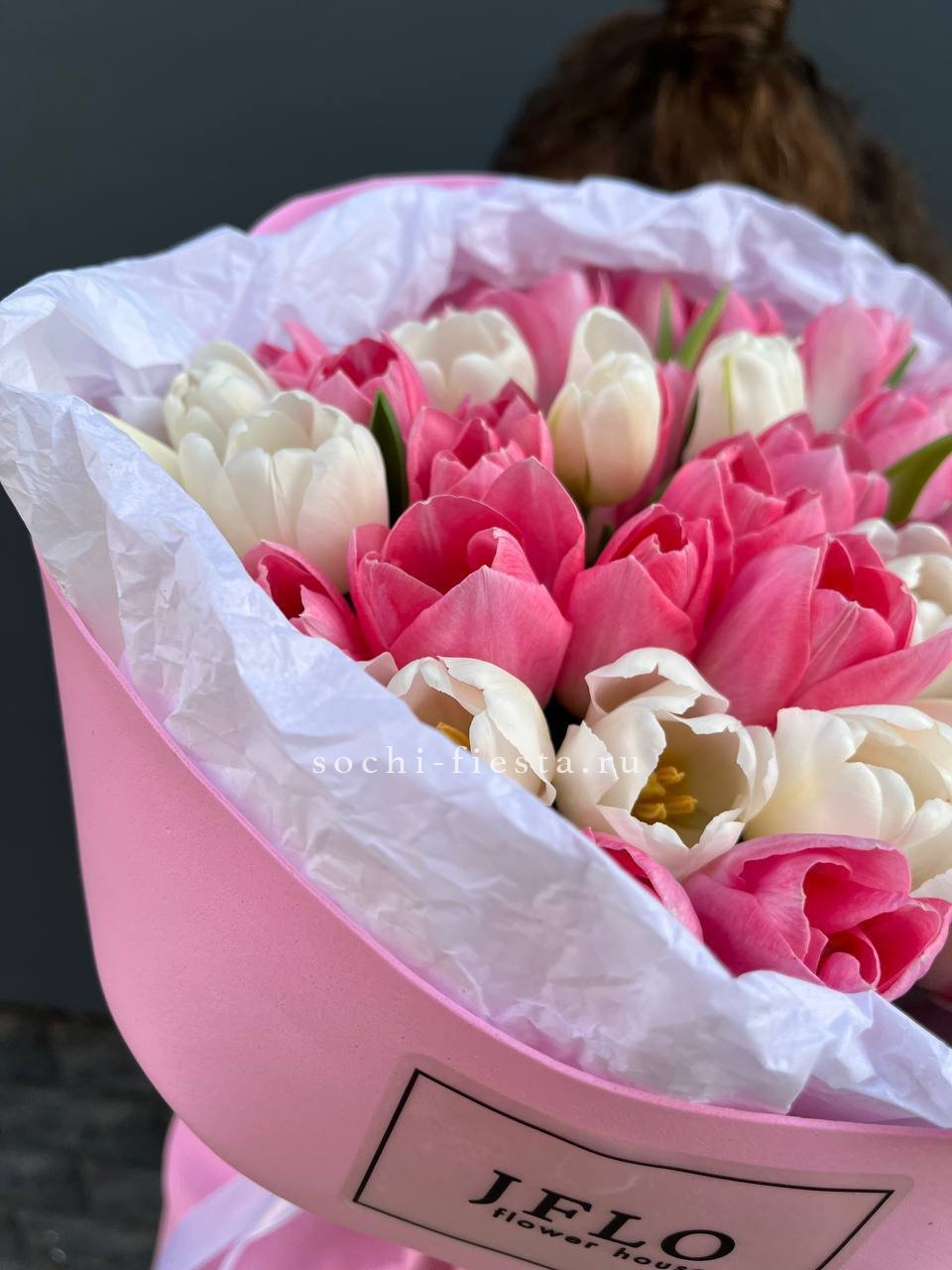 Пятьдесят один бутон в мягкой бело-розовой гамме создает объемную форму с живым ритмом. Микс оттенков добавляет воздушности и естественной динамики композиции.