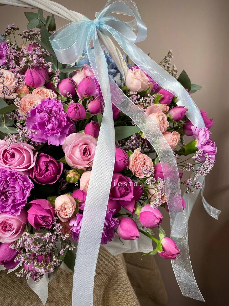 гортензия, кустовые розы, розы, лимониум, эвкалипт, лента, корзина D40.