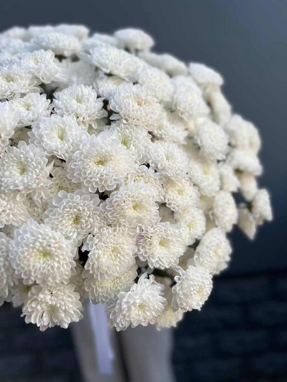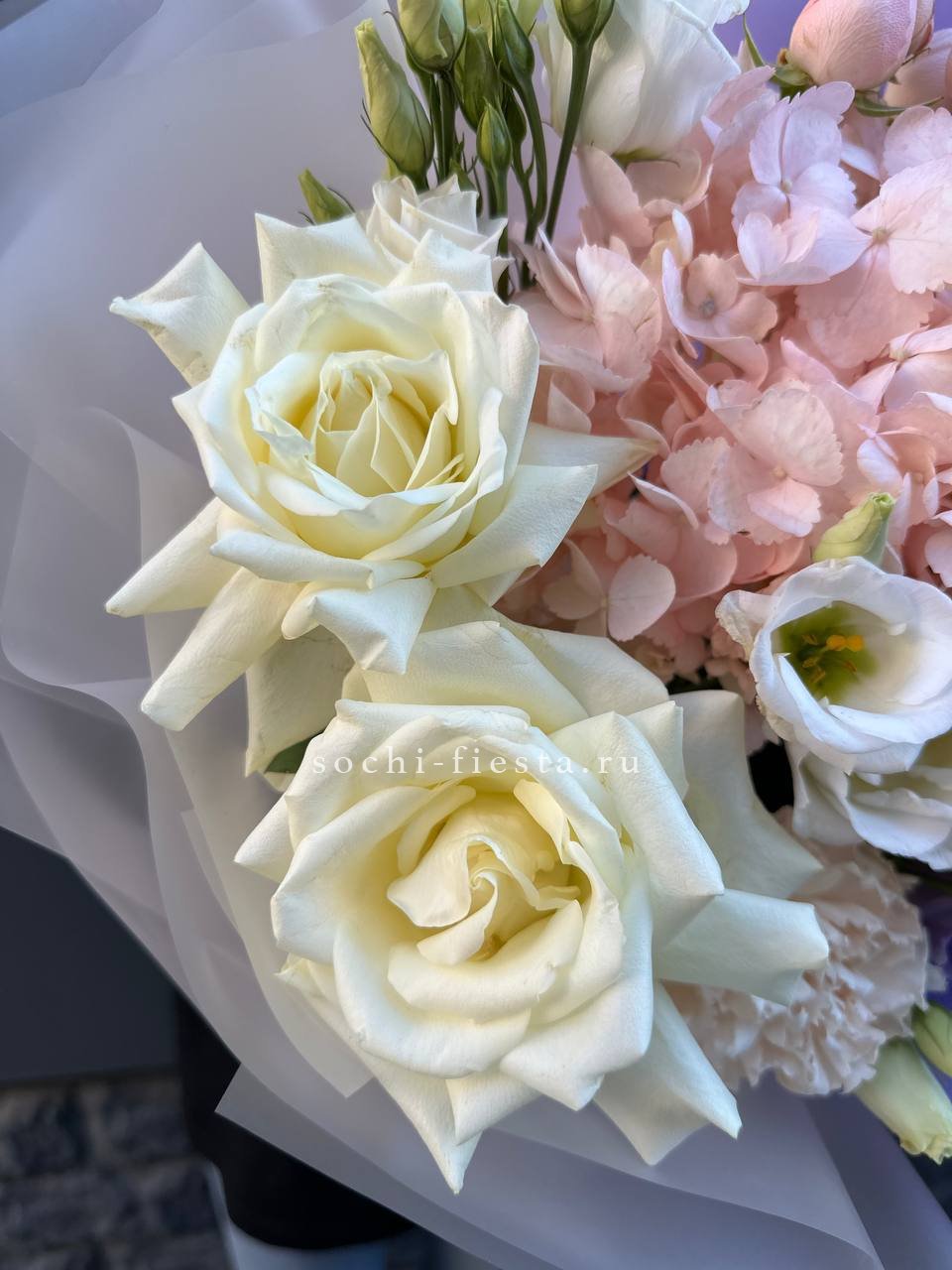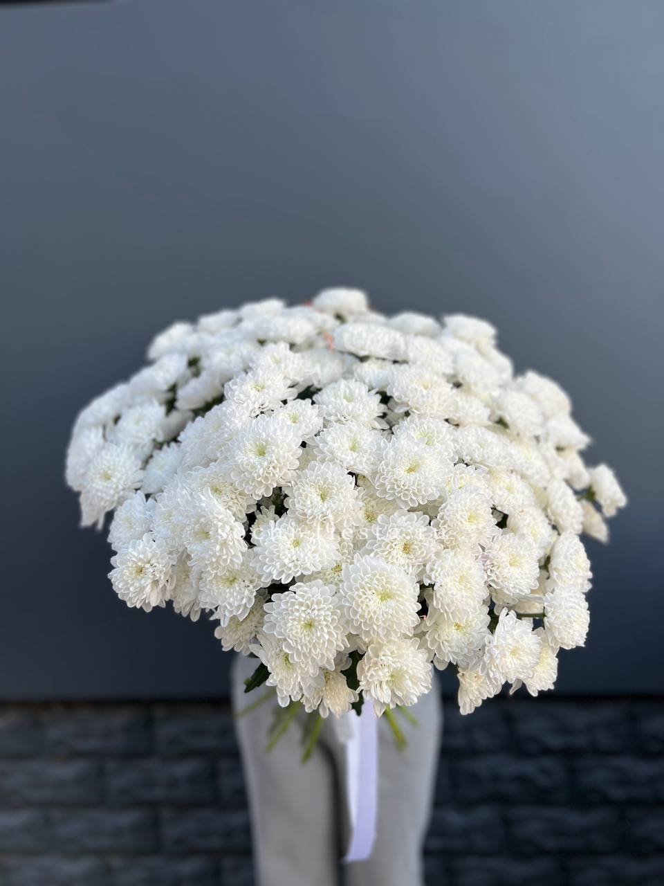 Белоснежные бутоны собраны в лаконичную форму с воздушной текстурой упаковки. Чистота линий и свежесть делают композицию универсальной для любого момента.