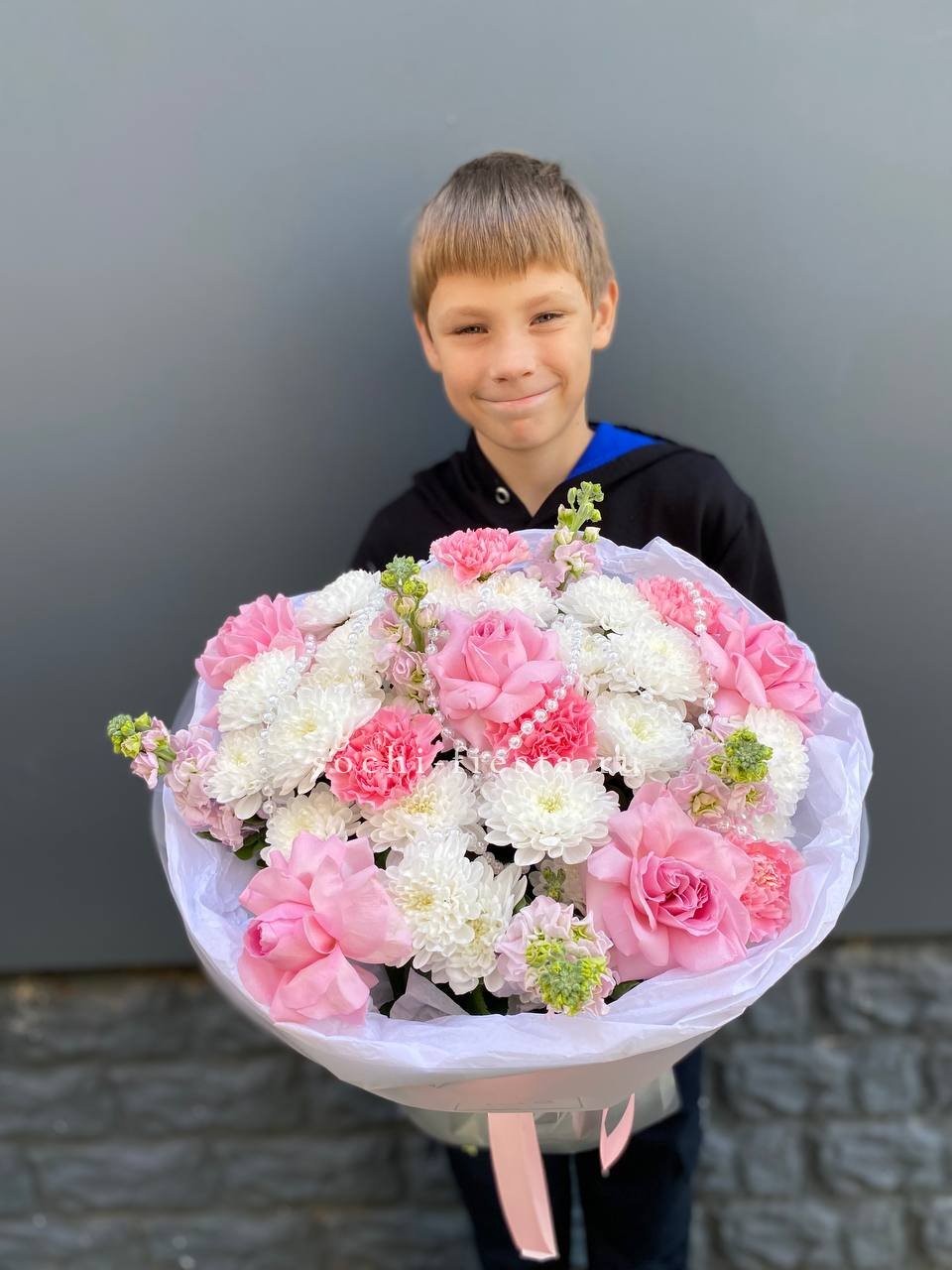 Хризантемы и розы соединяются с диантусами и маттиолой в яркой композиции. Декоративные бусины вплетаются в оформление и задают игривое настроение всему букету.