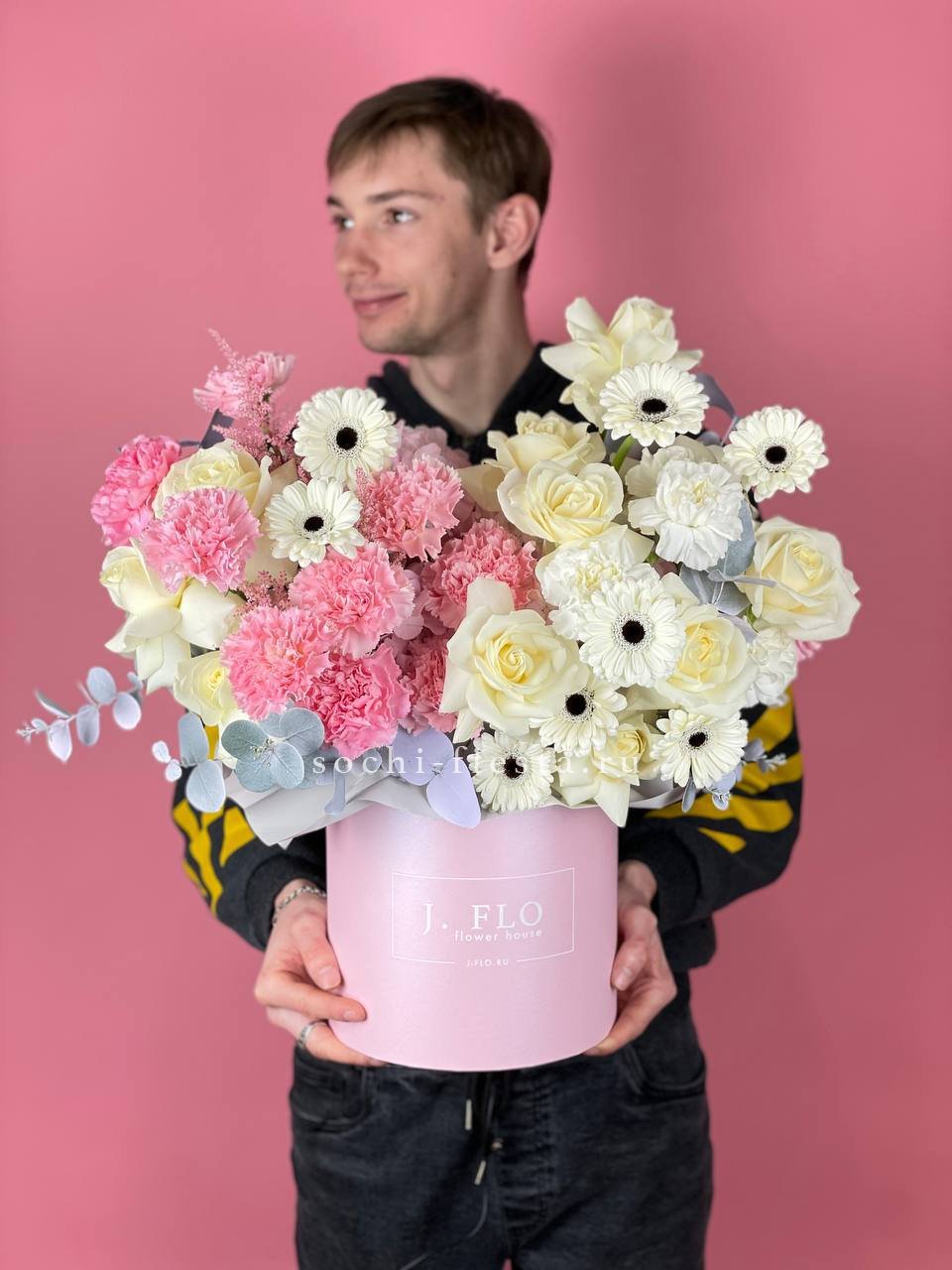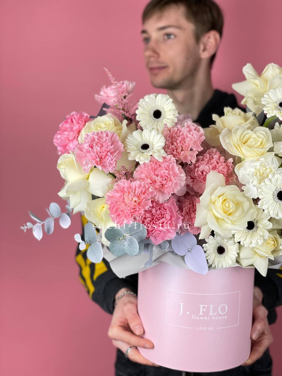 Эта роскошная композиция в модной упаковке объединяет благородные цветы с разными текстурами, создавая многогранный и богатый образ. Деликатные оттенки символизируют утонченность, элегантность и безупречный вкус. Букет подчеркнет индивидуальность дарителя и станет незабываемым акцентом любого торжества.