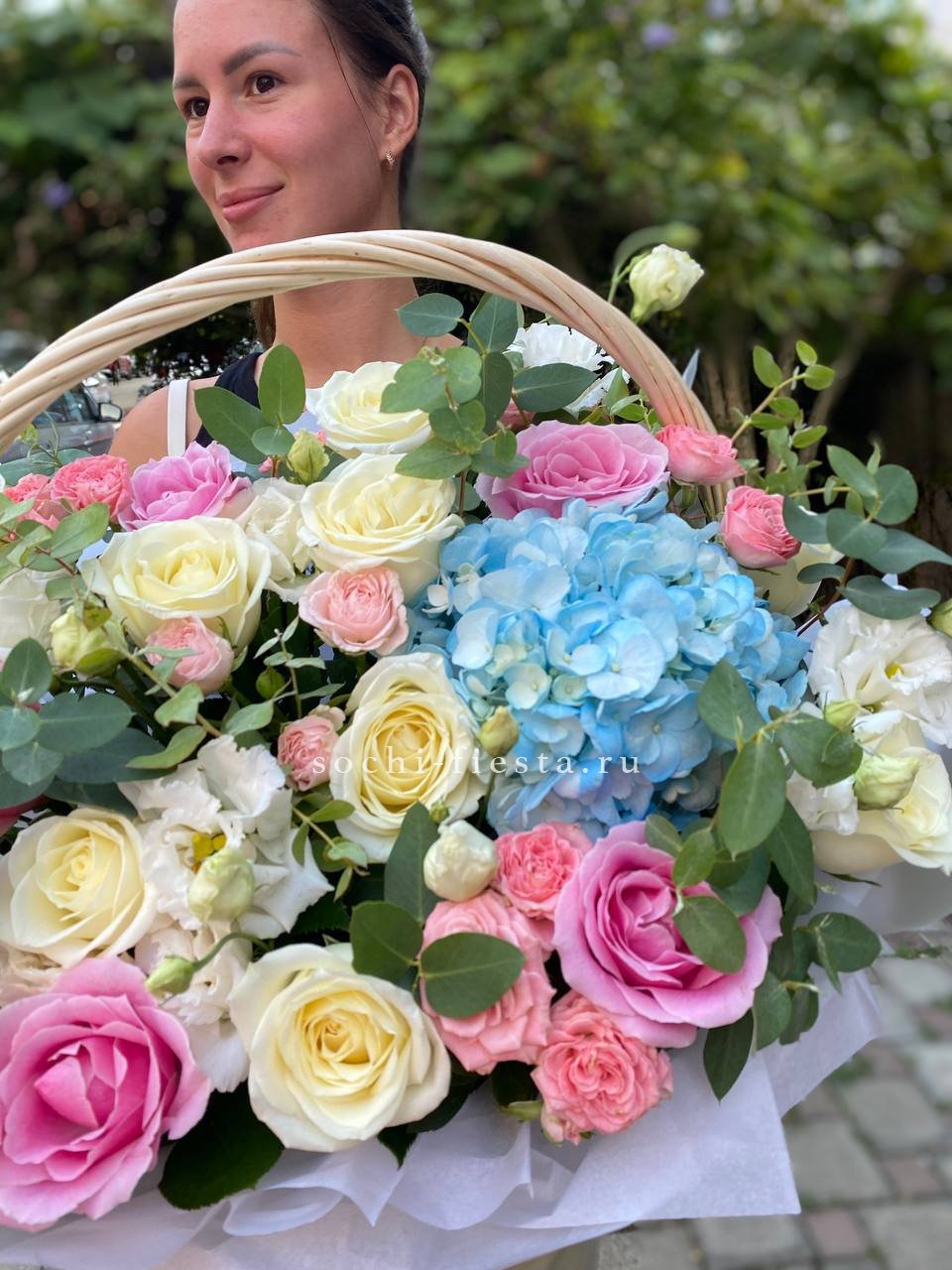 Мисти Баблс и гортензии в воздушной упаковке дарят ощущение свежести раннего утра. Лёгкая структура букета сохраняет форму и долго радует глаз.