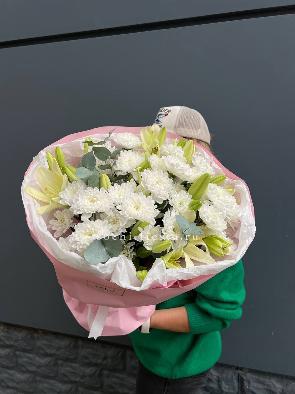 Погрузитесь в облако нежности и аромата! Этот восхитительный букет объединяет пышные шапки хризантем, изысканные бутоны лилий и свежий эвкалипт. Сочетание текстур и деликатных оттенков белого создает ощущение легкости и свежести. Это идеальный подарок для выражения самых светлых и теплых чувств, который растопит любое сердце и наполнит дом чудесным запахом.