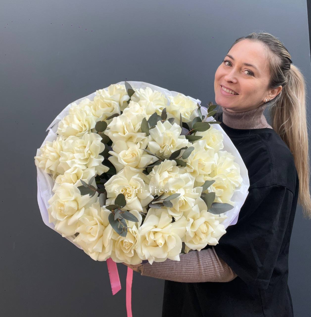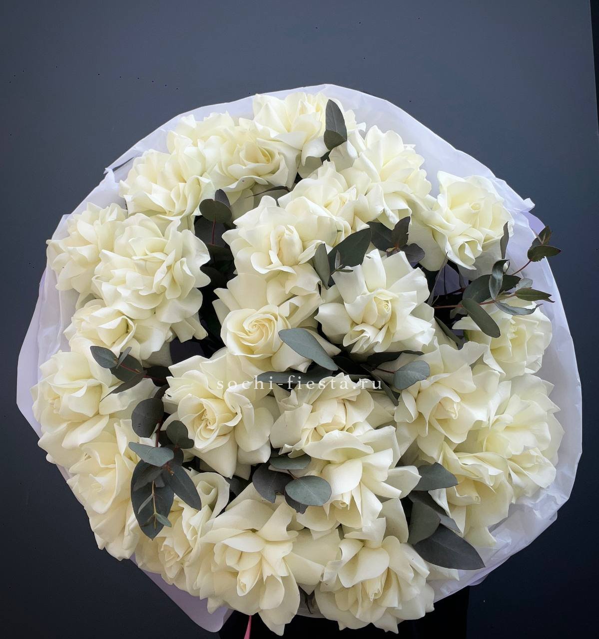 пионовидная роза, хамелациум (замена в несезон), эвкалипт, авторское оформление.