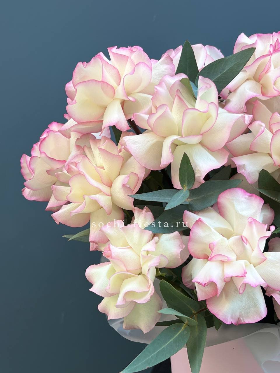 Пышные бутоны Сара Бернар раскрываются среди лепестков роз и воздушной гортензии. Эустома добавляет графичности, а эвкалипт собирает композицию в единый силуэт. Цветовая гамма плавно перетекает от розового к голубому.