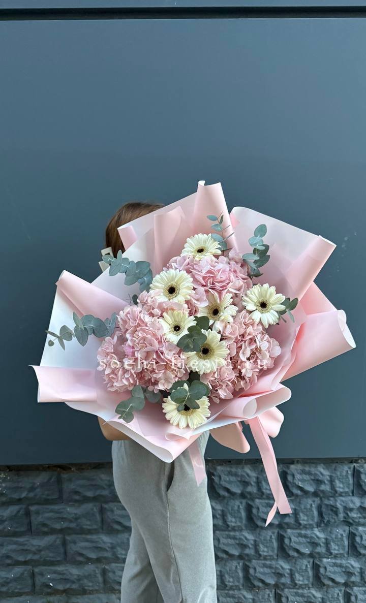 Гортензия создаёт воздушную базу, а герберы добавляют яркие точки цвета. Эвкалипт заполняет пространство между бутонами и придаёт композиции завершённость. Букет выглядит свежо и легко.