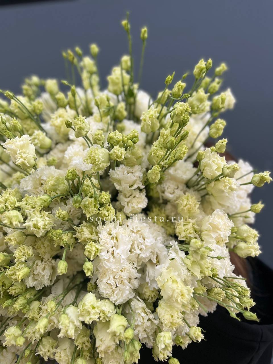 Монохромная композиция из белоснежных эустом в количестве пятидесяти одной штуки. Масштабная сборка впечатляет чистотой линий и графичным присутствием в пространстве.
