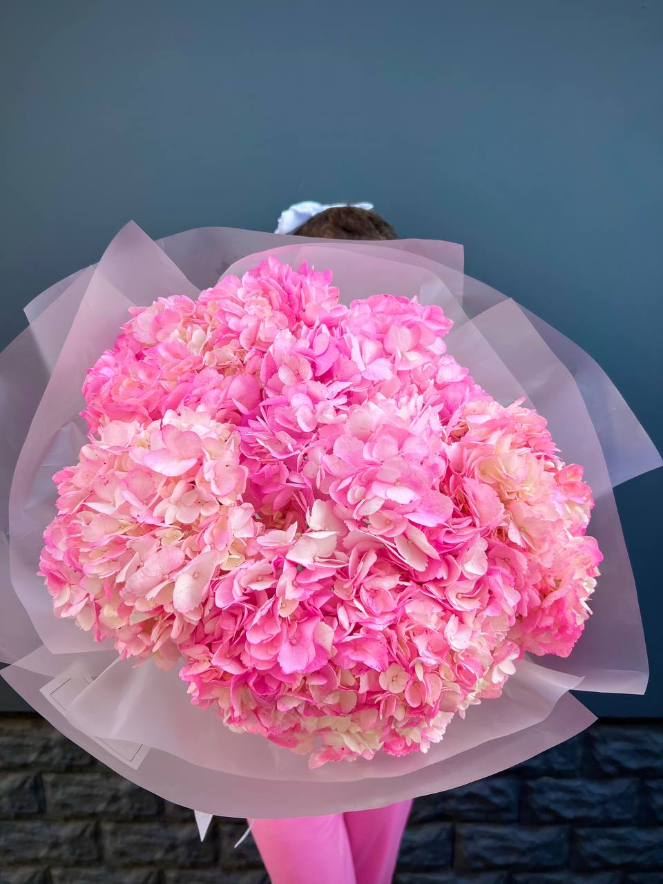 Пятнадцать соцветий гортензии образуют густую сферу с насыщенной глубиной цвета. Объёмная композиция заполняет пространство и притягивает внимание своей плотностью.