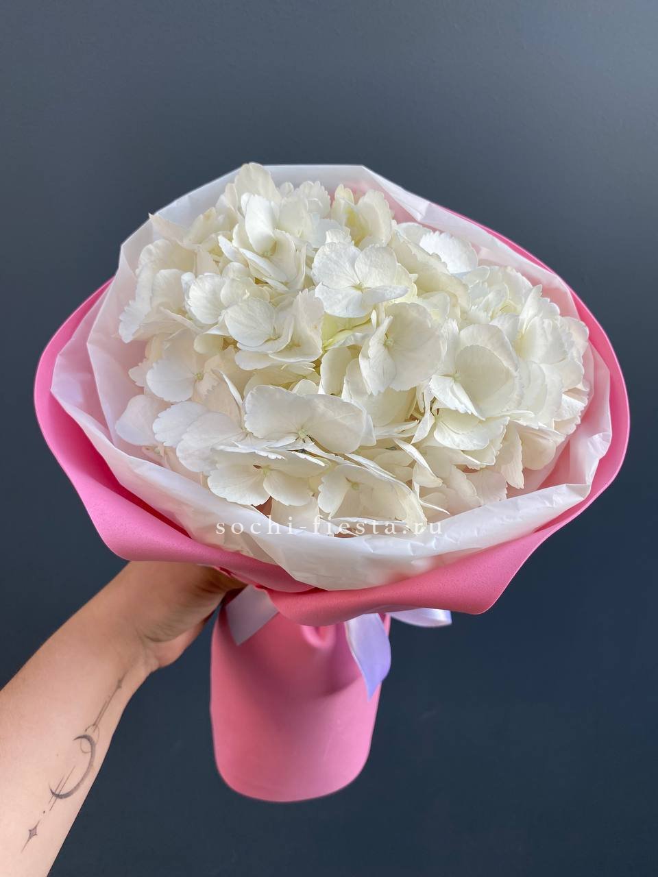 3 белых гортензии, лента, дизайнерская пленка.