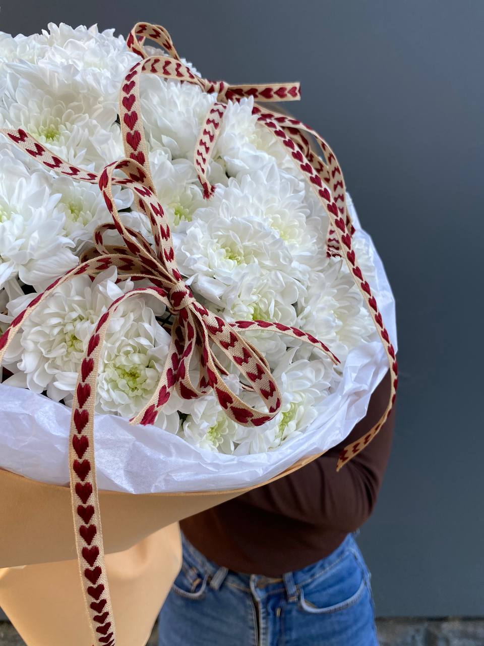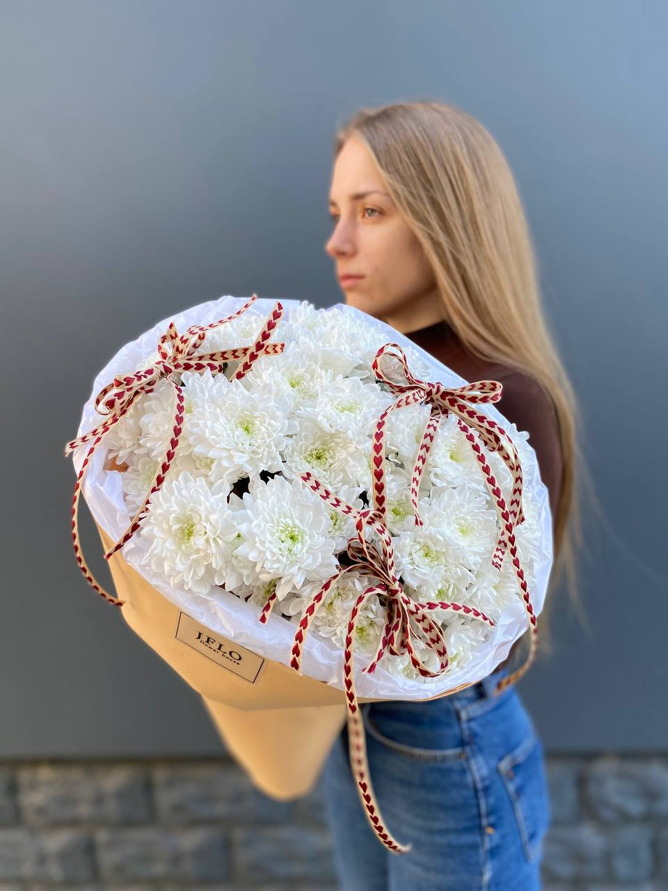 хризантема кустовая - 17 веток, тишью, дизайнерская упаковка, лента.