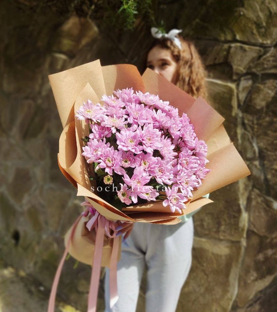 9-11 веток хризантем сантини, лента, дизайнерская упаковка.