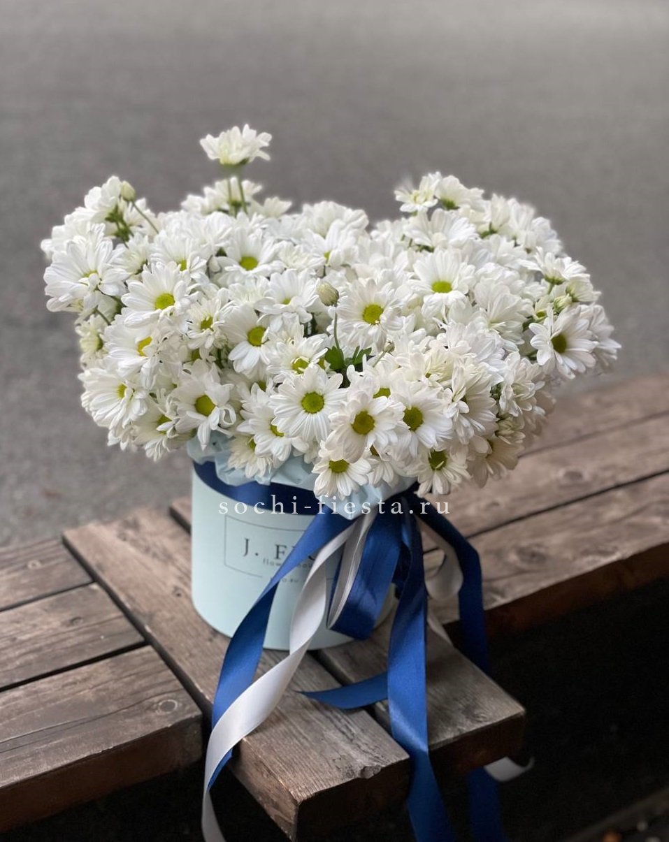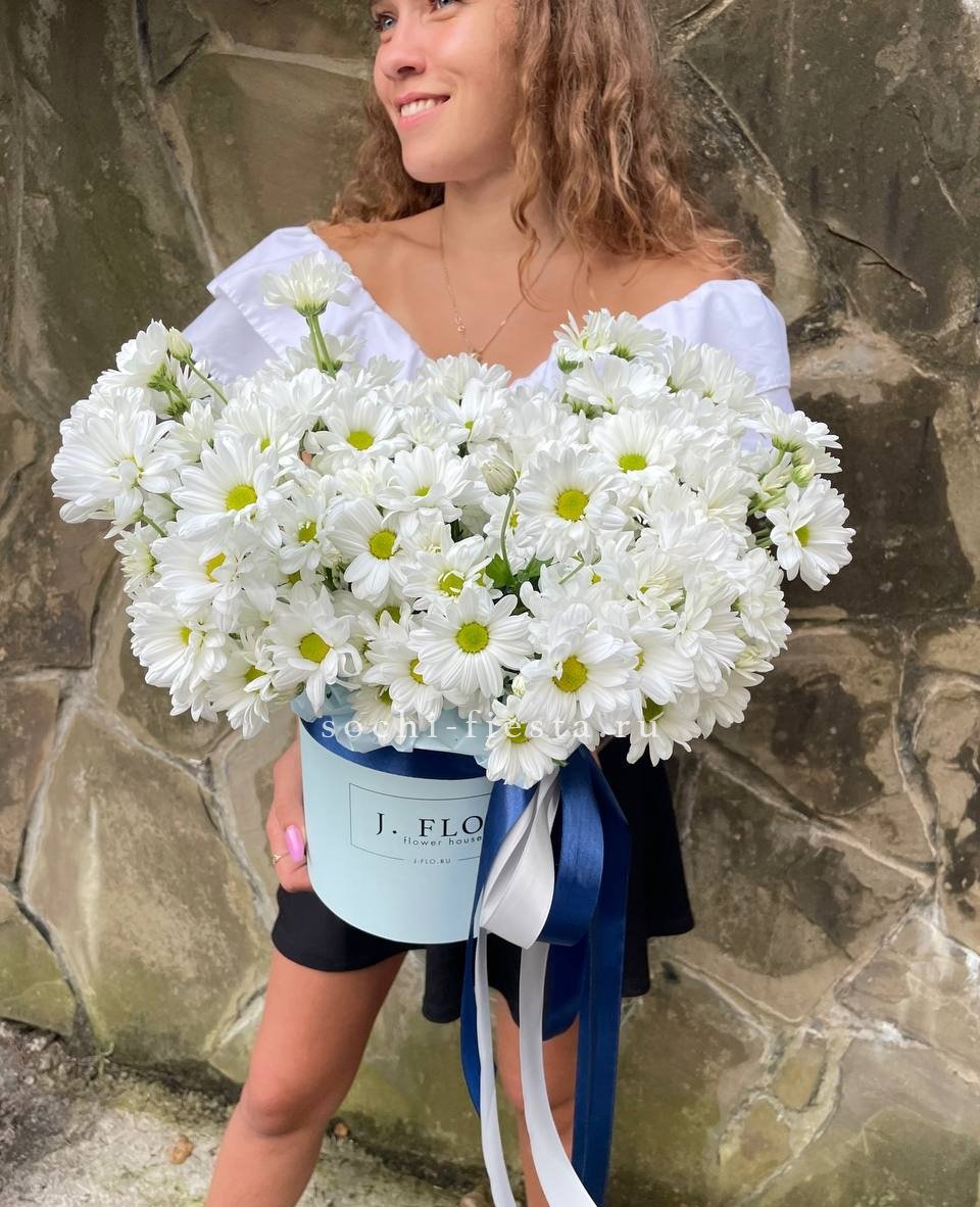 Тридцать девять белоснежных хризантем образуют плотное облако с чёткими графичными линиями. Крупные соцветия создают объёмную структуру, которая держит форму и привлекает внимание своей архитектурой.
