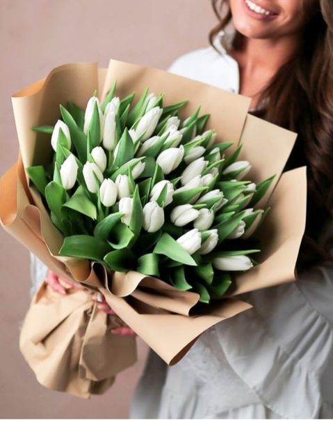 101 белый тюльпан, лента, крафт или дизайнерская пленка.
