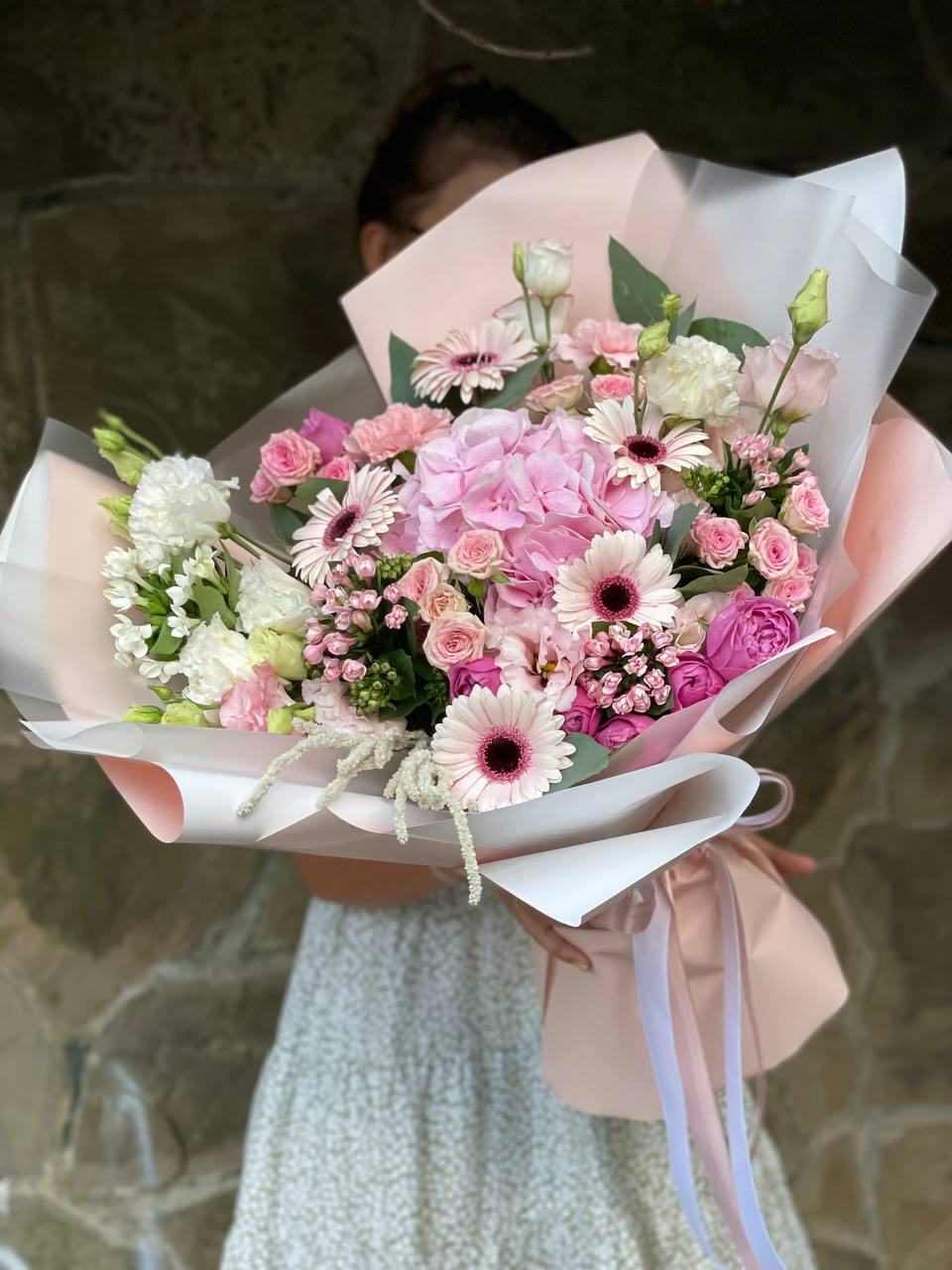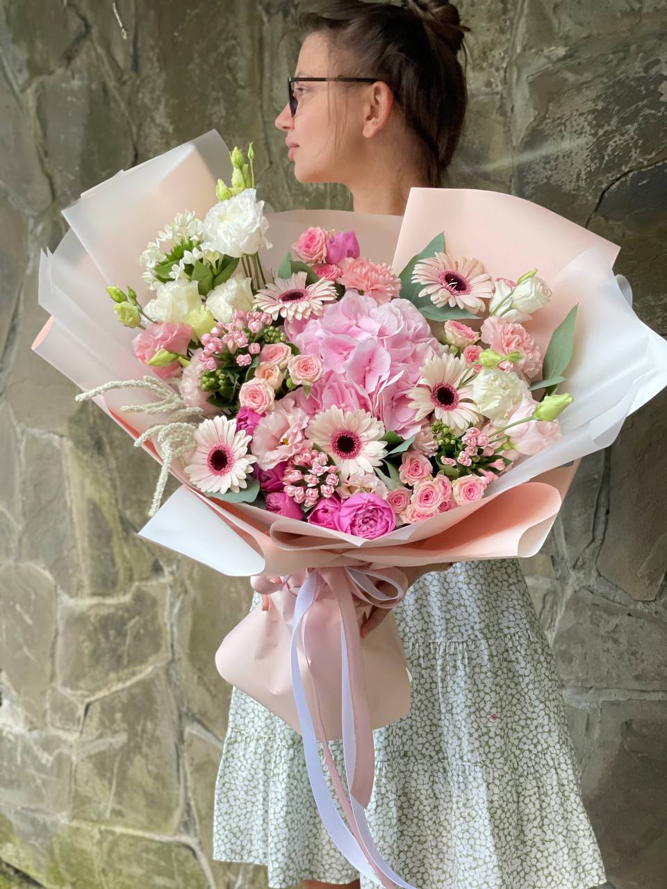 Пышные шапки гортензии переплетаются с бархатными бутонами пионовидных роз, создавая объёмную композицию насыщенного розового оттенка. Орхидеи и эустома добавляют воздушности, а диантус расставляет яркие точки. Букет заполняет пространство и притягивает взгляд своей плотной структурой.