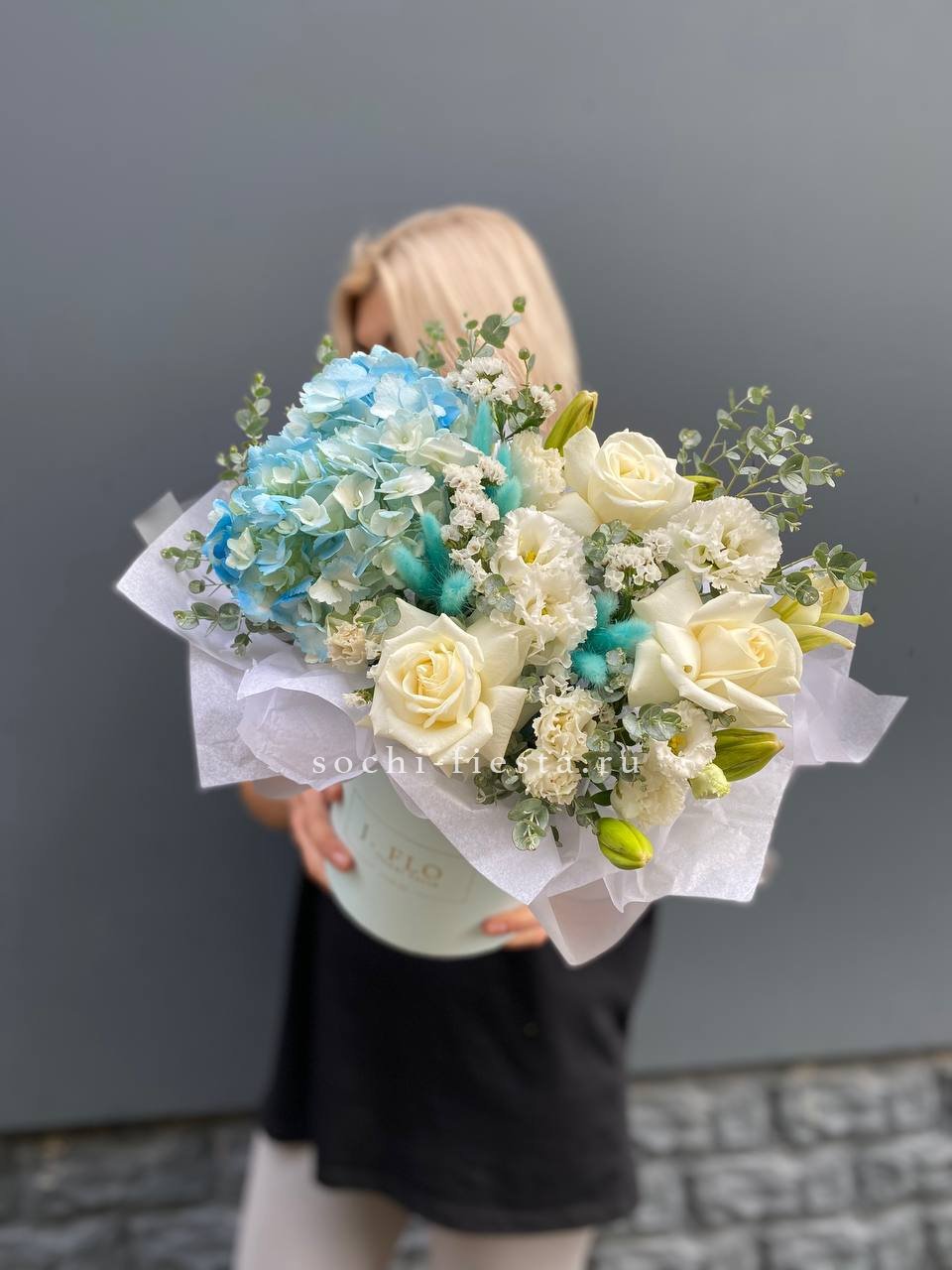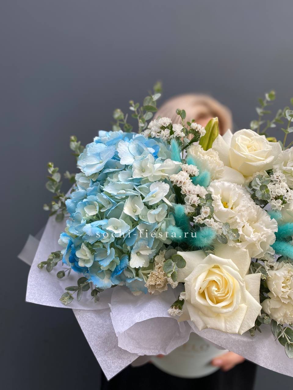гортензия, кустовая пионовидная роза, протея, эустома, озотамнус, дизайнерское оформление.