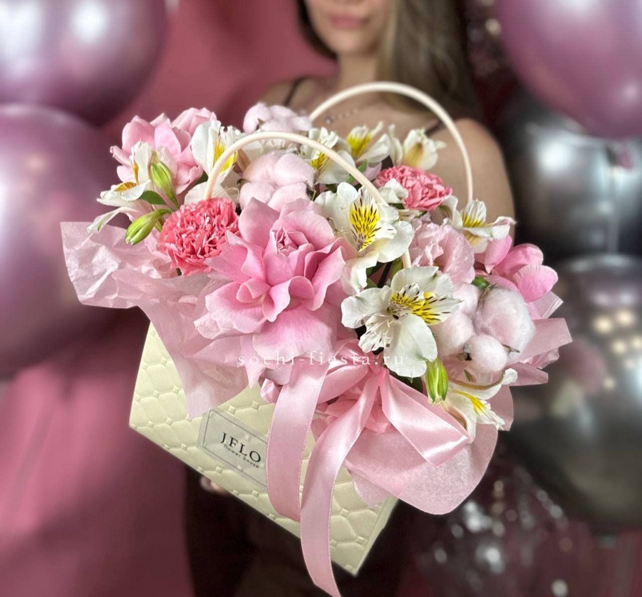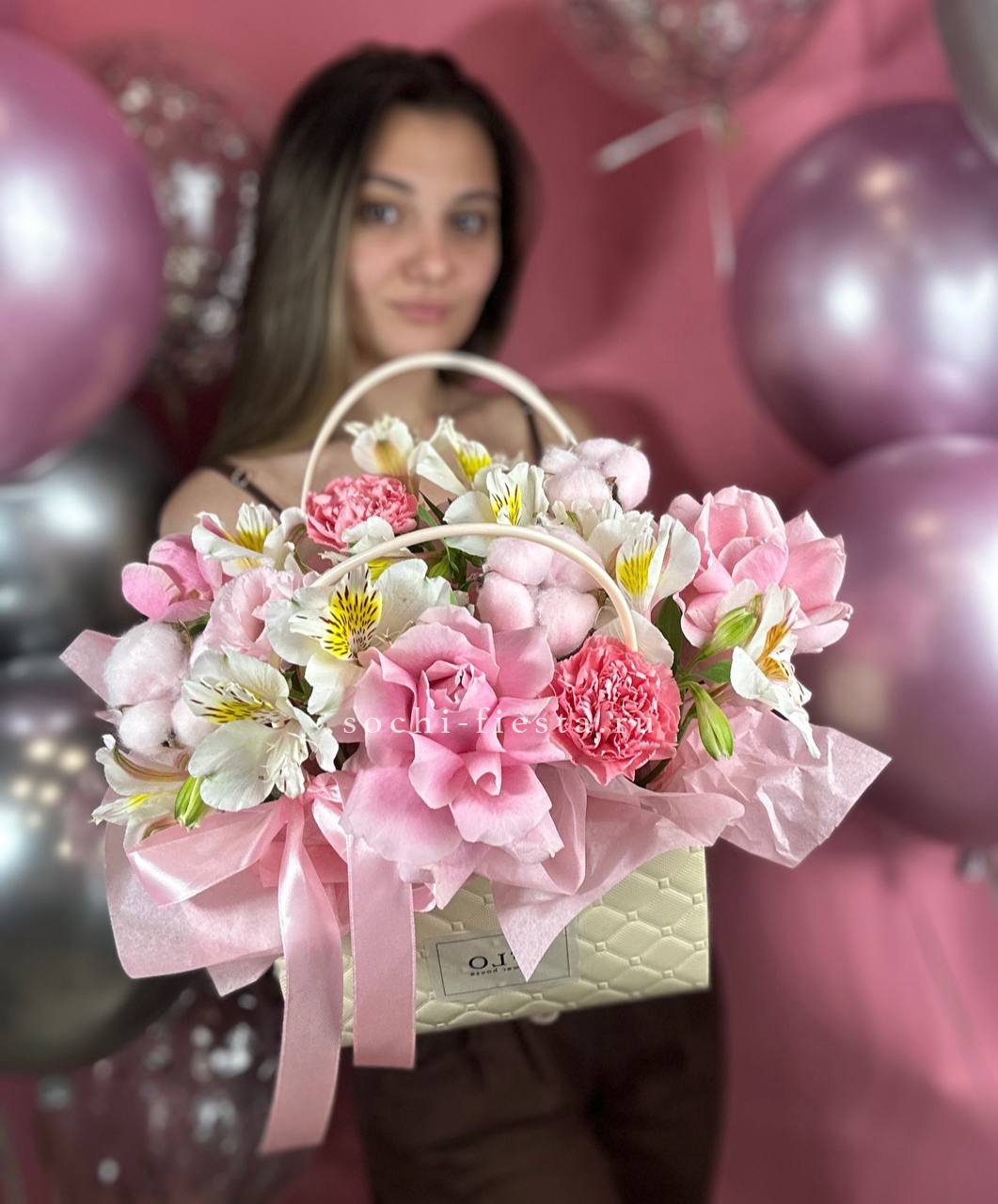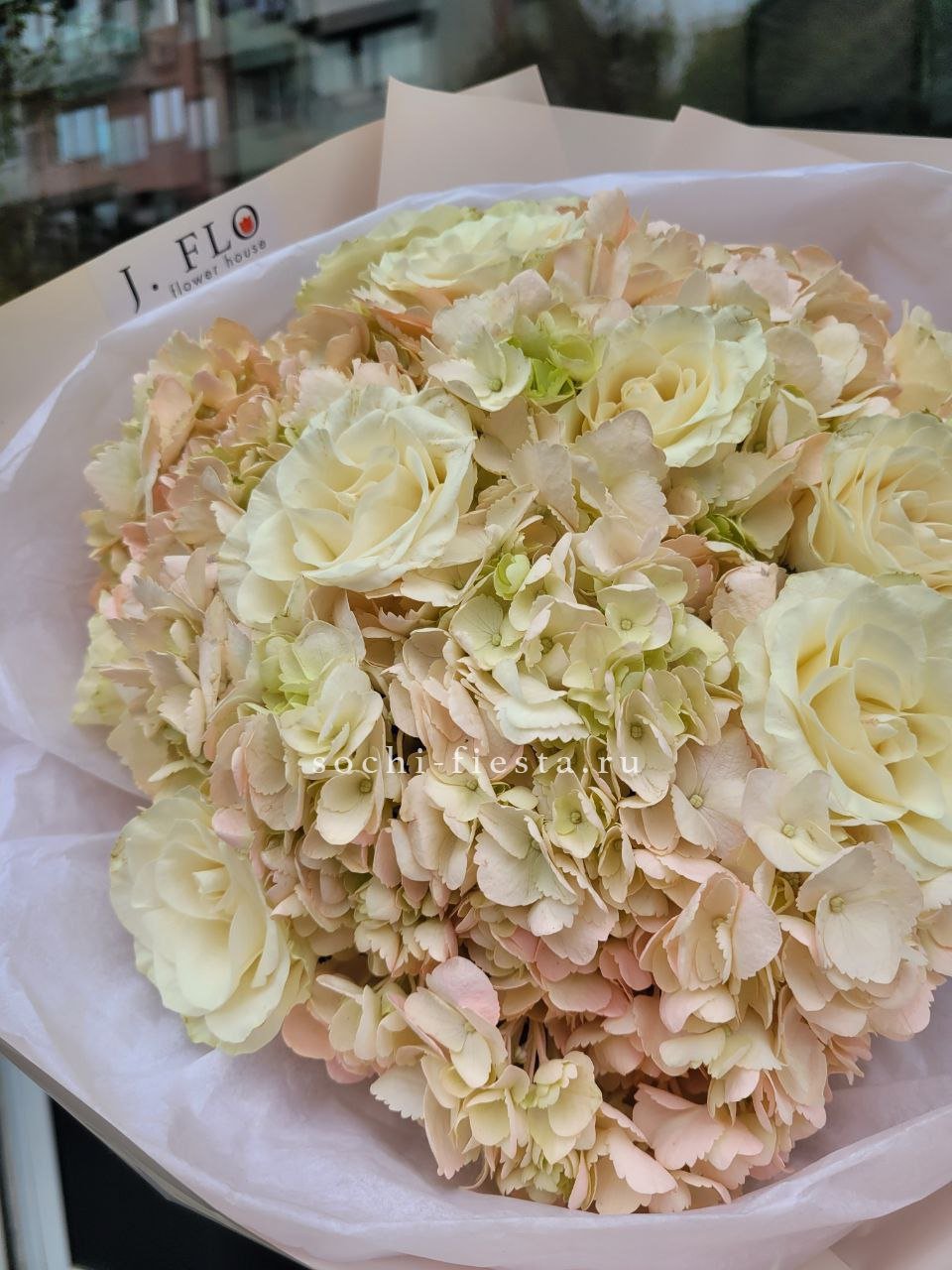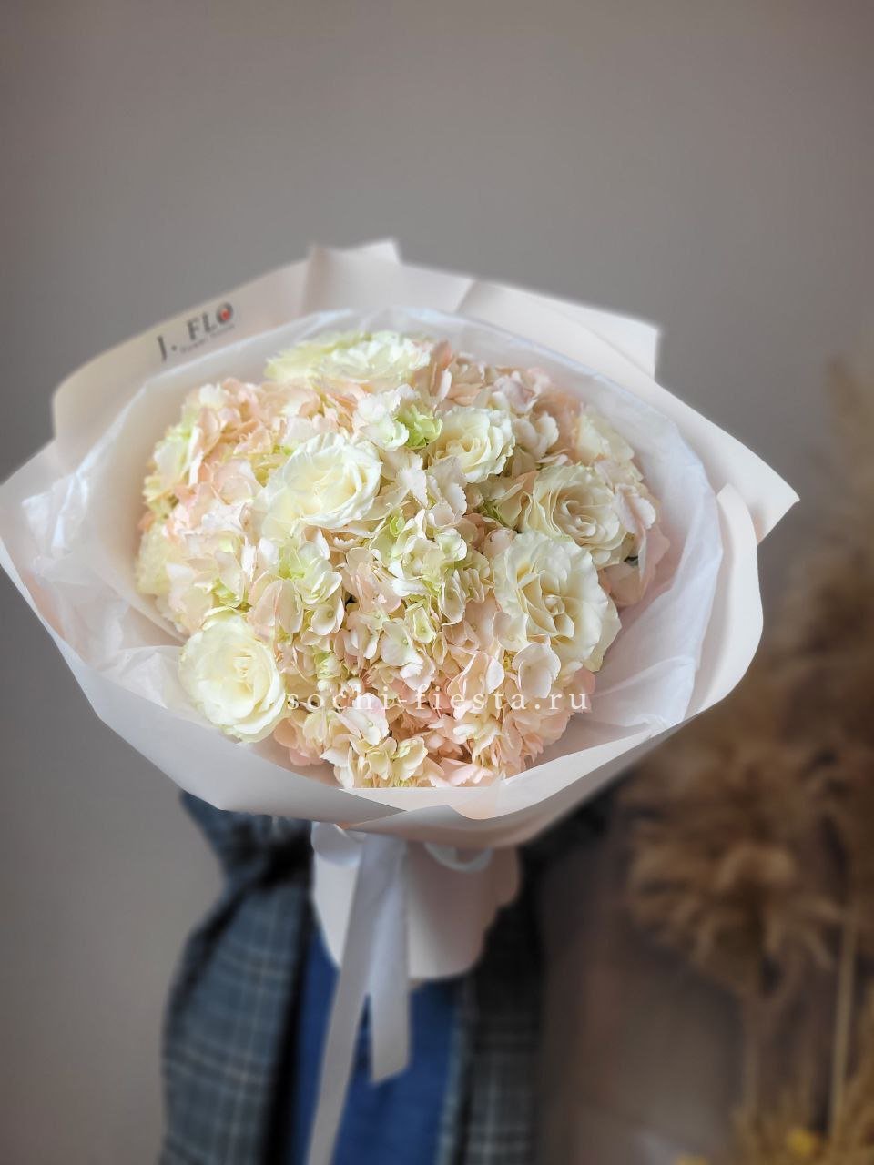 Сочетание вывернутых роз с гортензией, диантусами, розами, бомбастиками создает воздушных элегантный образ идеального цветочного подарка