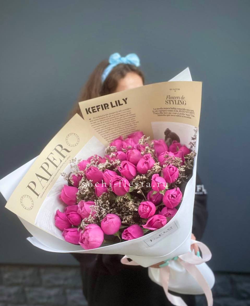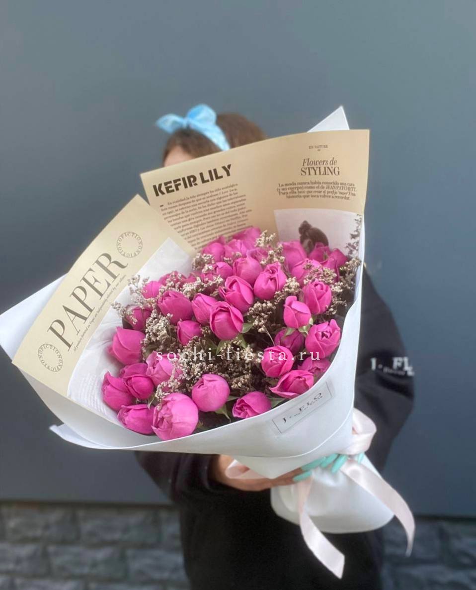 жёлтые тюльпаны, розы, эвкалипт, пленка.