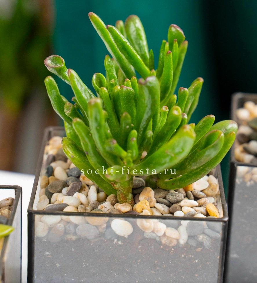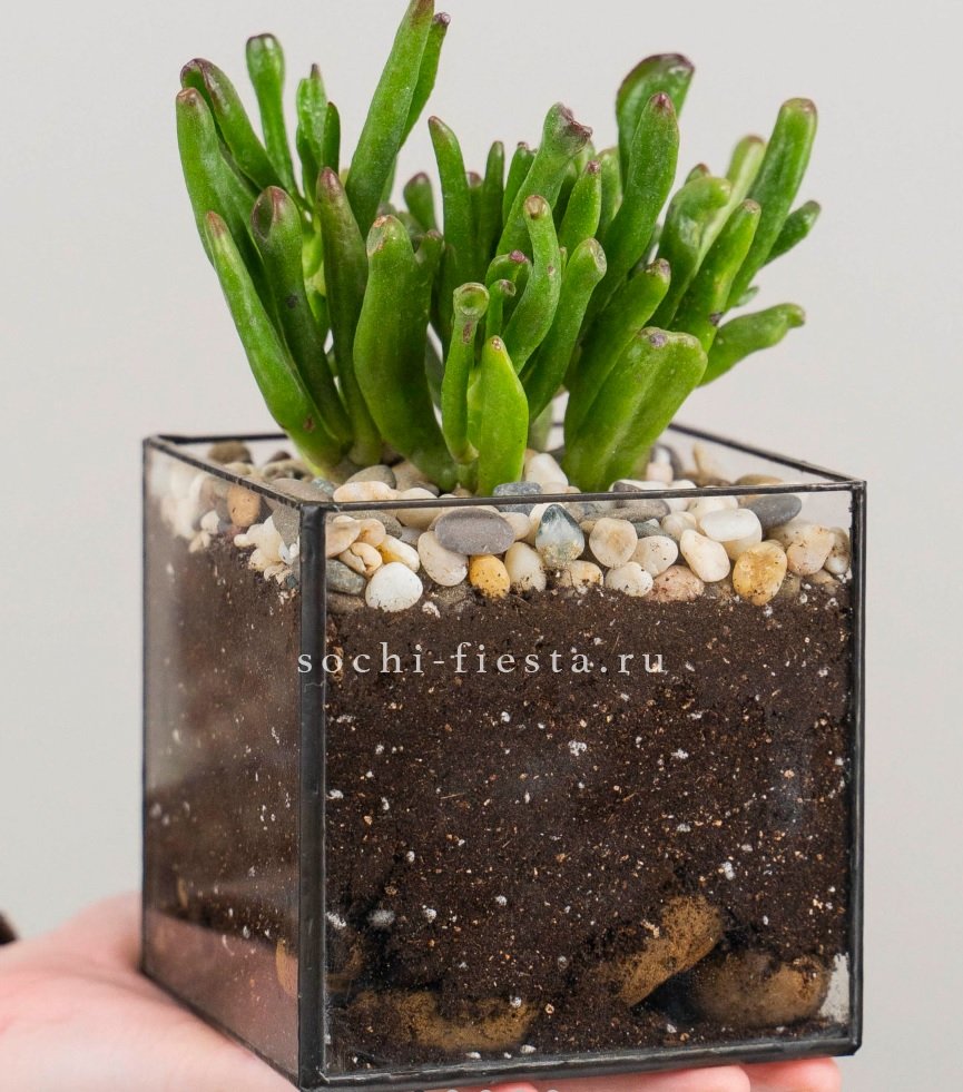 Компактный стеклянный куб с суккулентом Хоббит помещается на рабочем столе или полке. Миниатюрная композиция не занимает много места и живет без частого ухода.