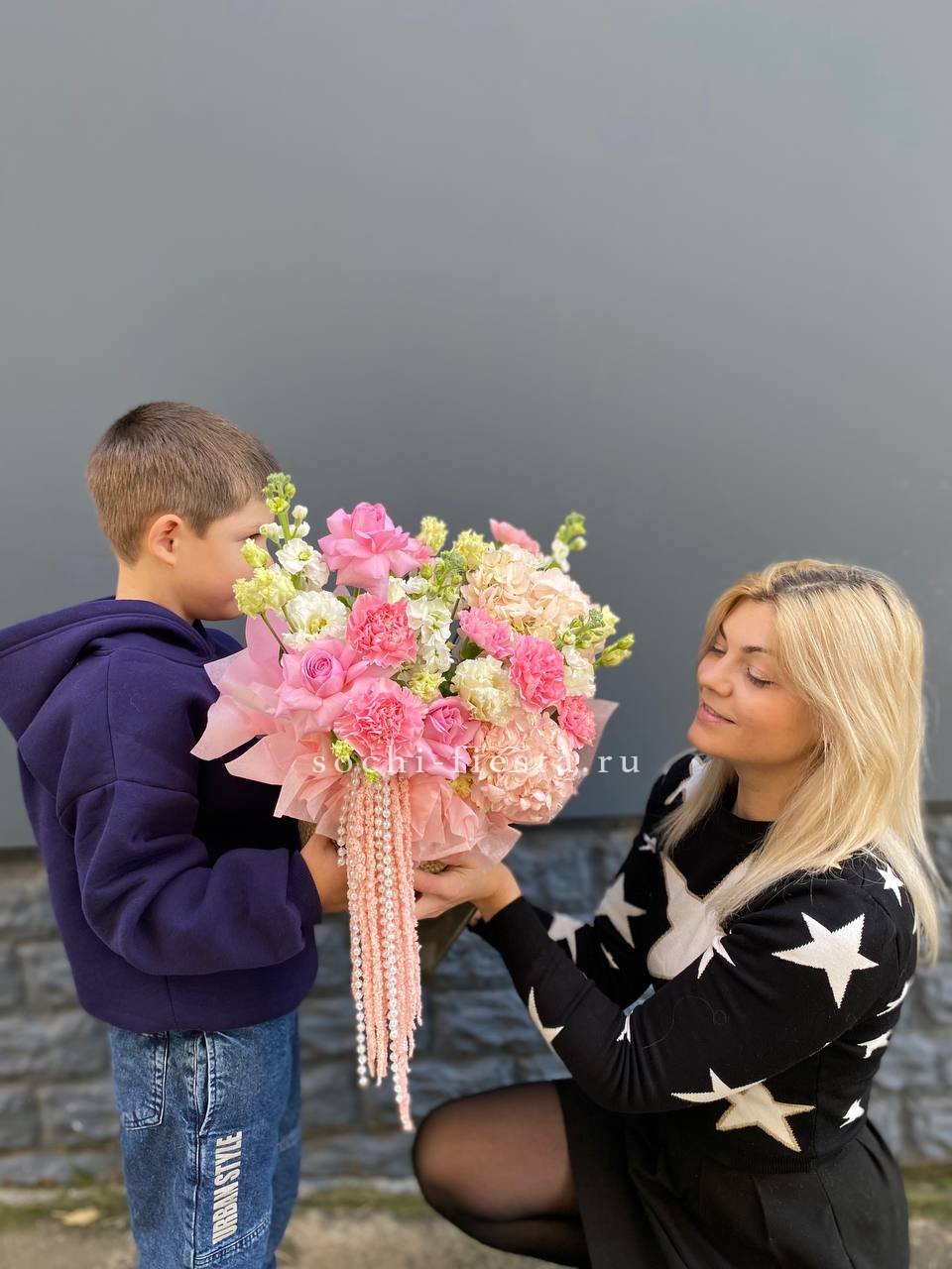 гортензия, диантус, розовые розы, маттиола, эустома, амарант, бусы (возможна замена), джутовое кашпо.