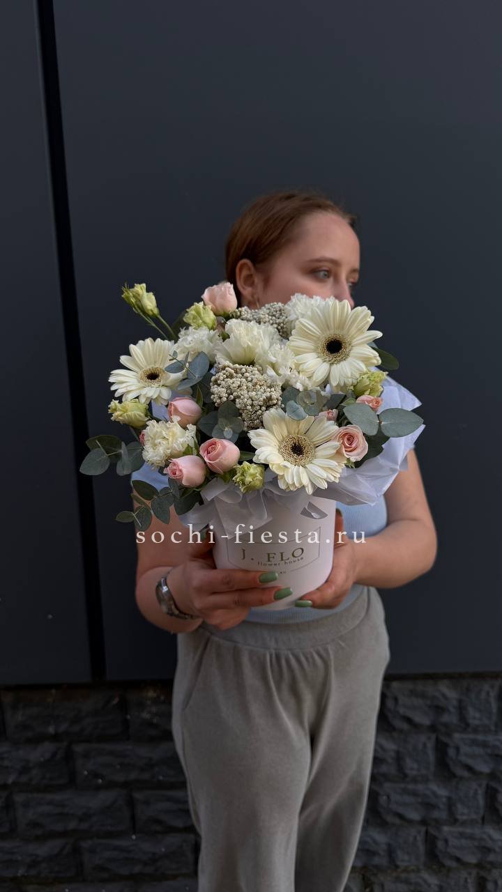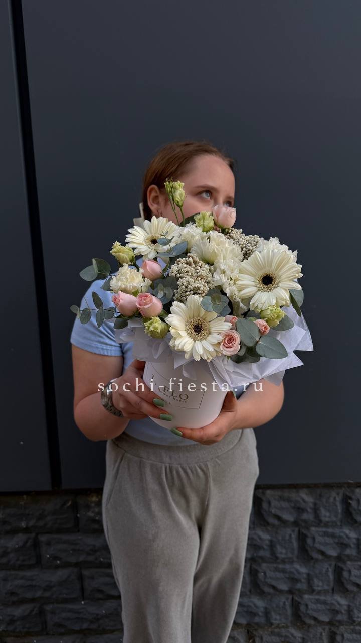 Белоснежные розы и воздушная эустома соседствуют с пышной гортензией и яркими вспышками статицы. Композиция собрана плотно, каждый цветок находит своё место в общем ритме.