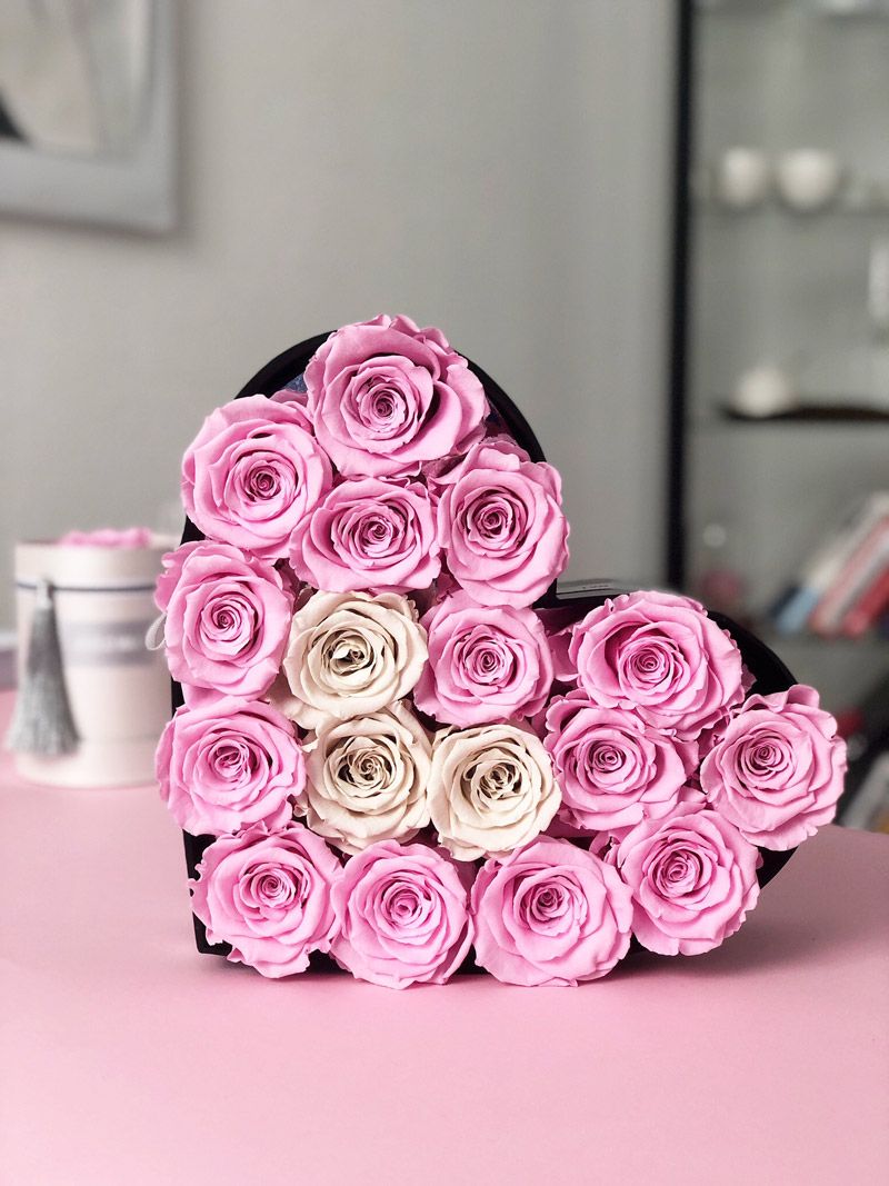 Эустомы и пионовидные розы соседствуют с французскими макарон в коробке в форме сердца. Диантусы и эвкалипт создают объём, а сладкий акцент делает композицию завершённой.