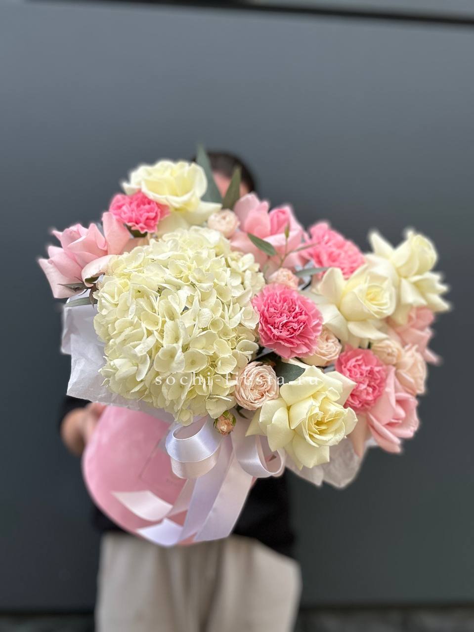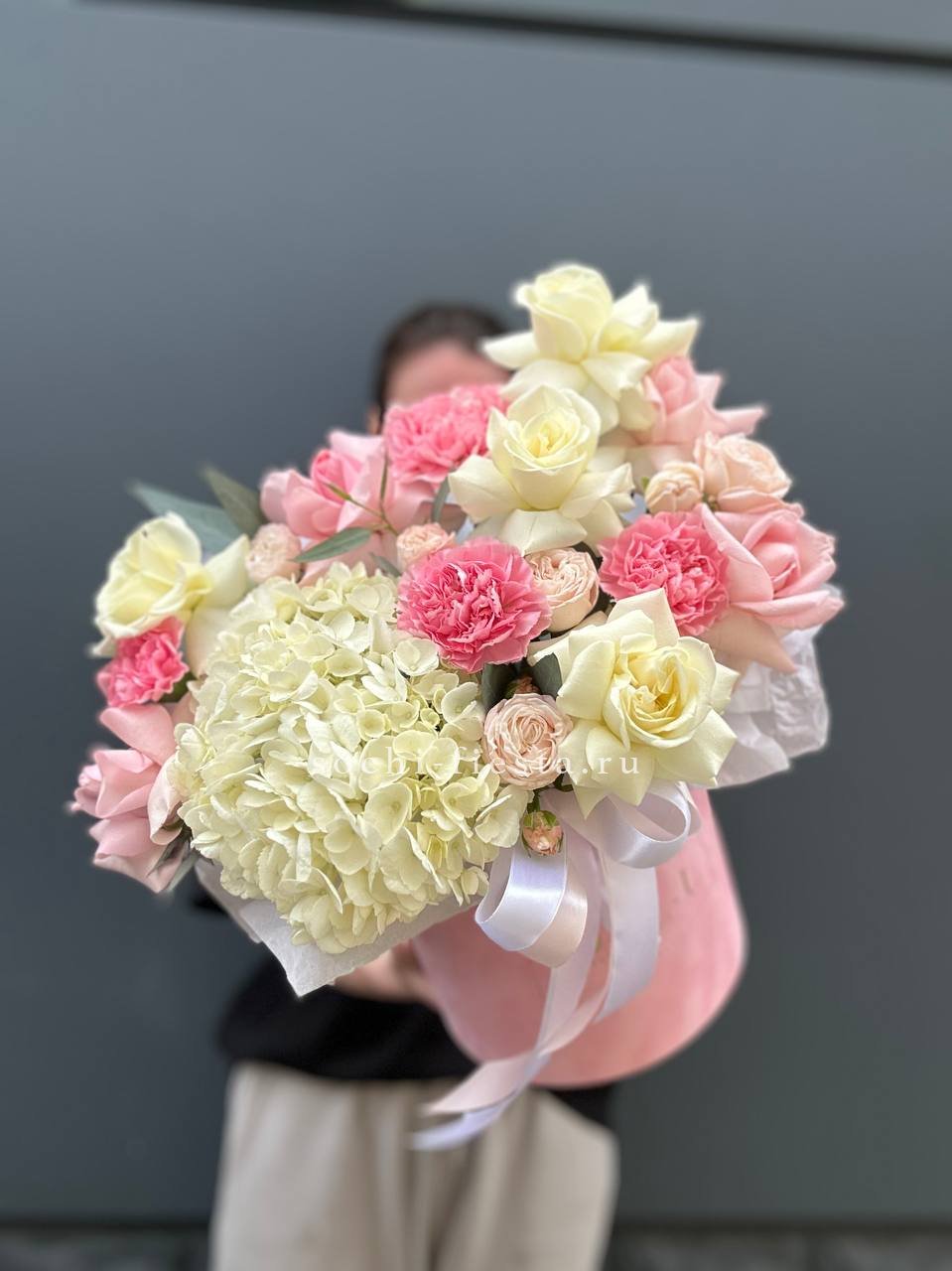 пион, розы одноголовые, гортензия, пионовидная роза, тишью, коробка D13 Цвет коробки может быть согласован с заказчиком.