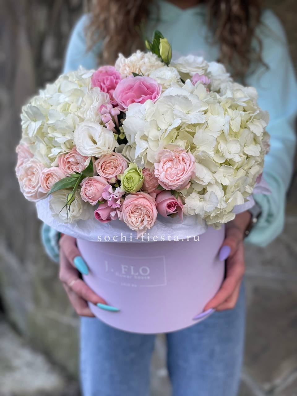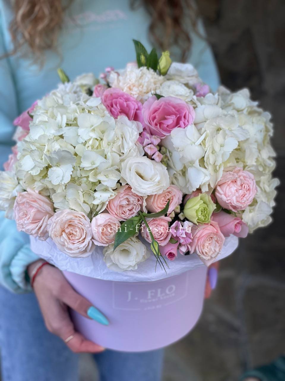 пионовидная кустовая роза, гортензия, одноголовая роза, эустома, бавардия, бокс D20.
