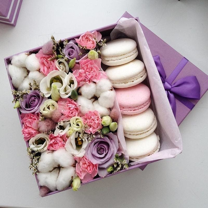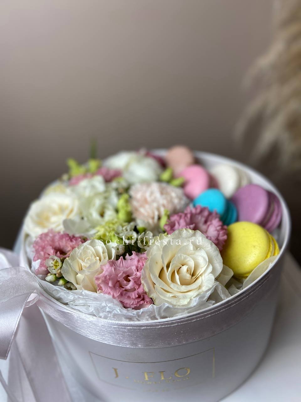 Круглая коробка с цветочной композицией в кремовых и пудровых тонах создаёт мягкое визуальное впечатление. Шесть макаронс дополняют нежную палитру светлого оформления.
