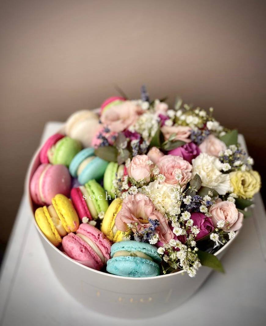 комбинация из цветочных элементов нежных оттенков, 6 макаронс, круглая коробка светлого оттенка.