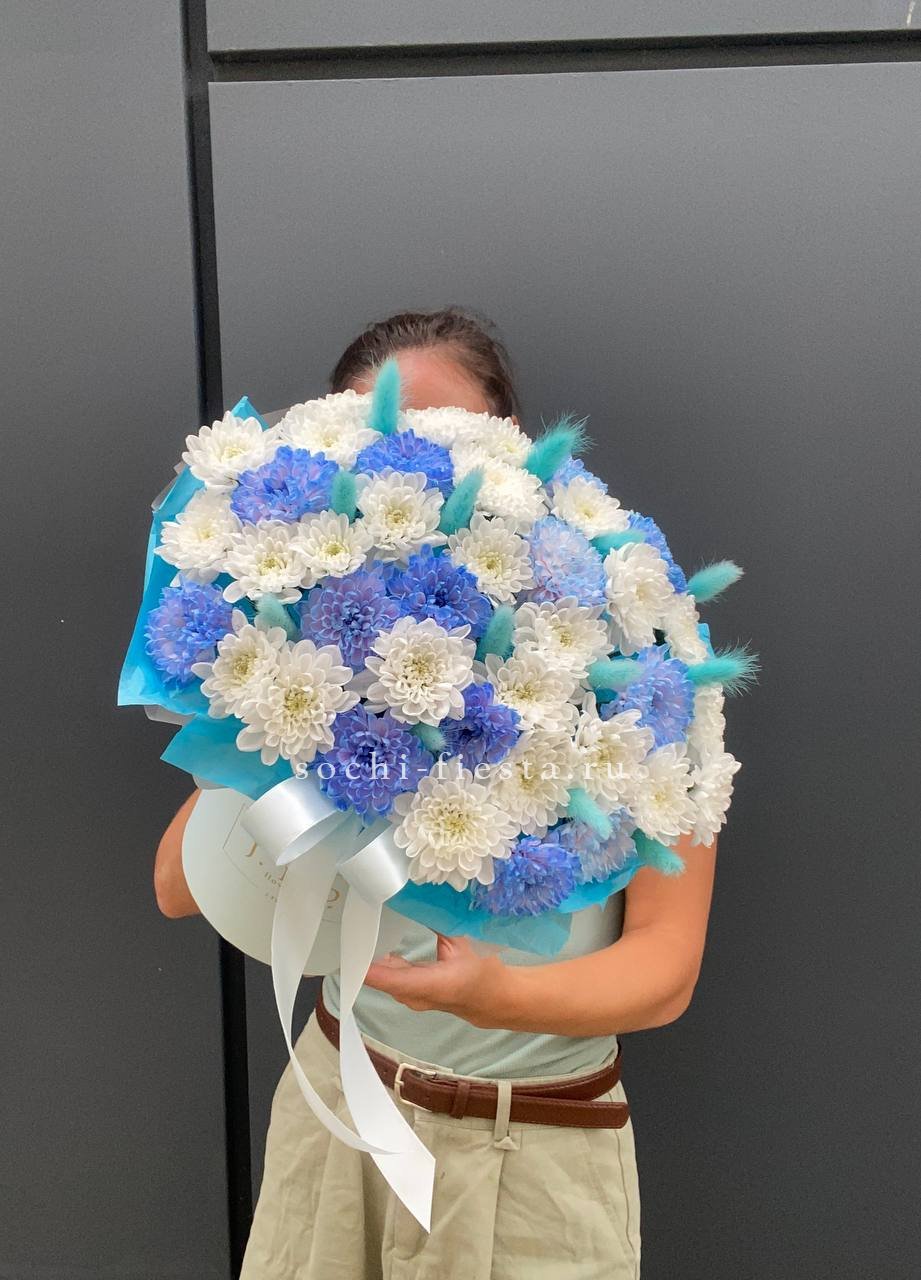 Пушистые соцветия хризантем и воздушный лагурус собраны в компактную коробочку. Голубая гамма напоминает морской бриз и летний день у воды.