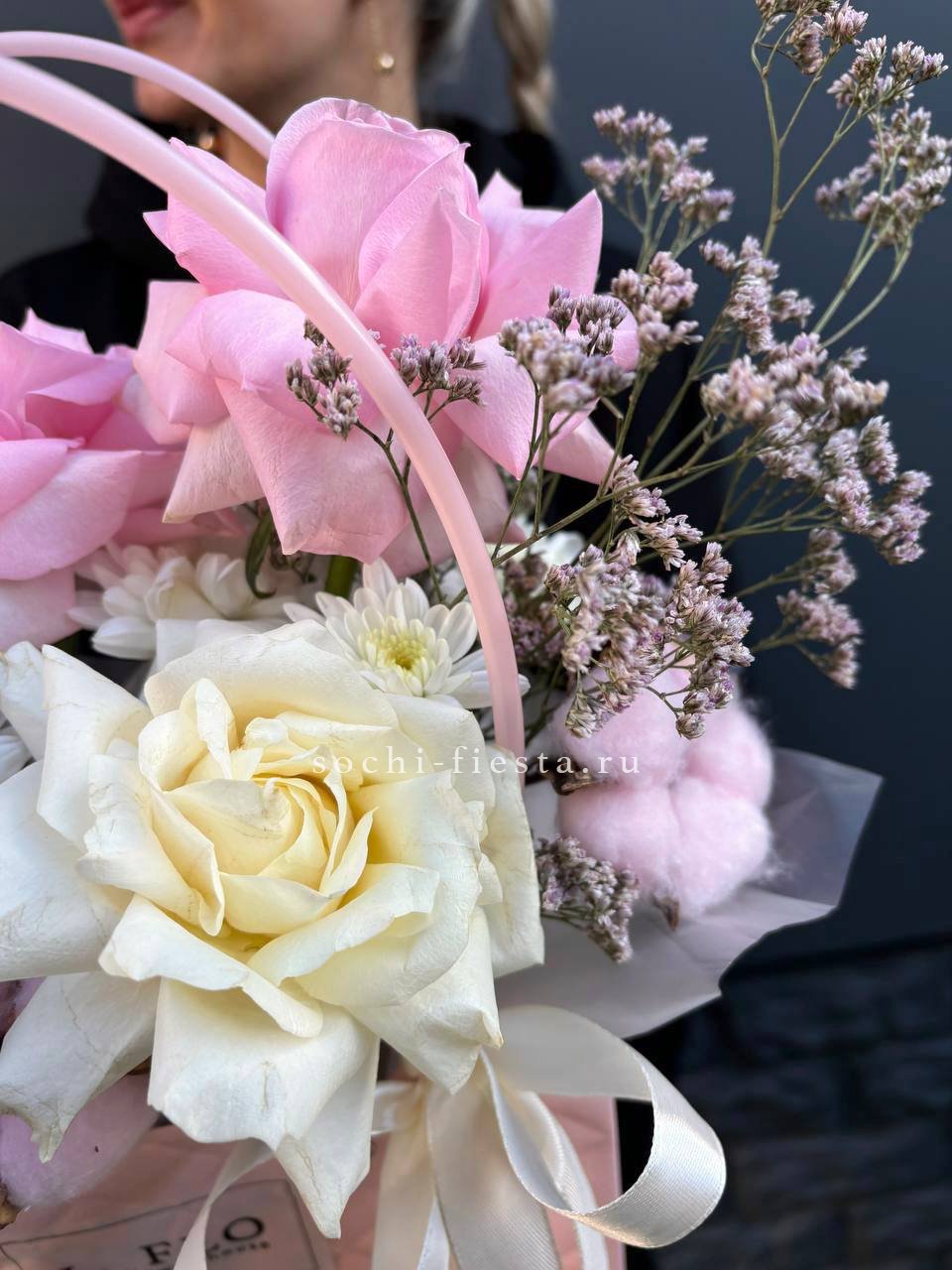 Розовые розы встречаются с орхидеей цимбидиум в объемной сумке-кашпо. Эустома и диантус создают многослойность, а кустовые розы заполняют пространство между крупными бутонами. Композиция держит форму и радует насыщенностью.