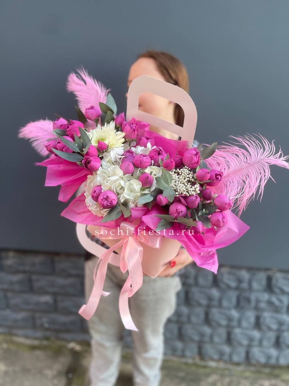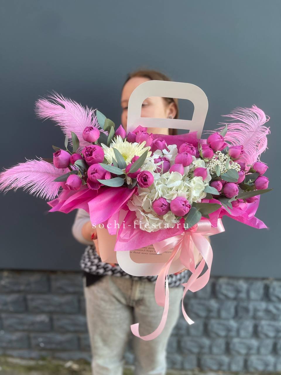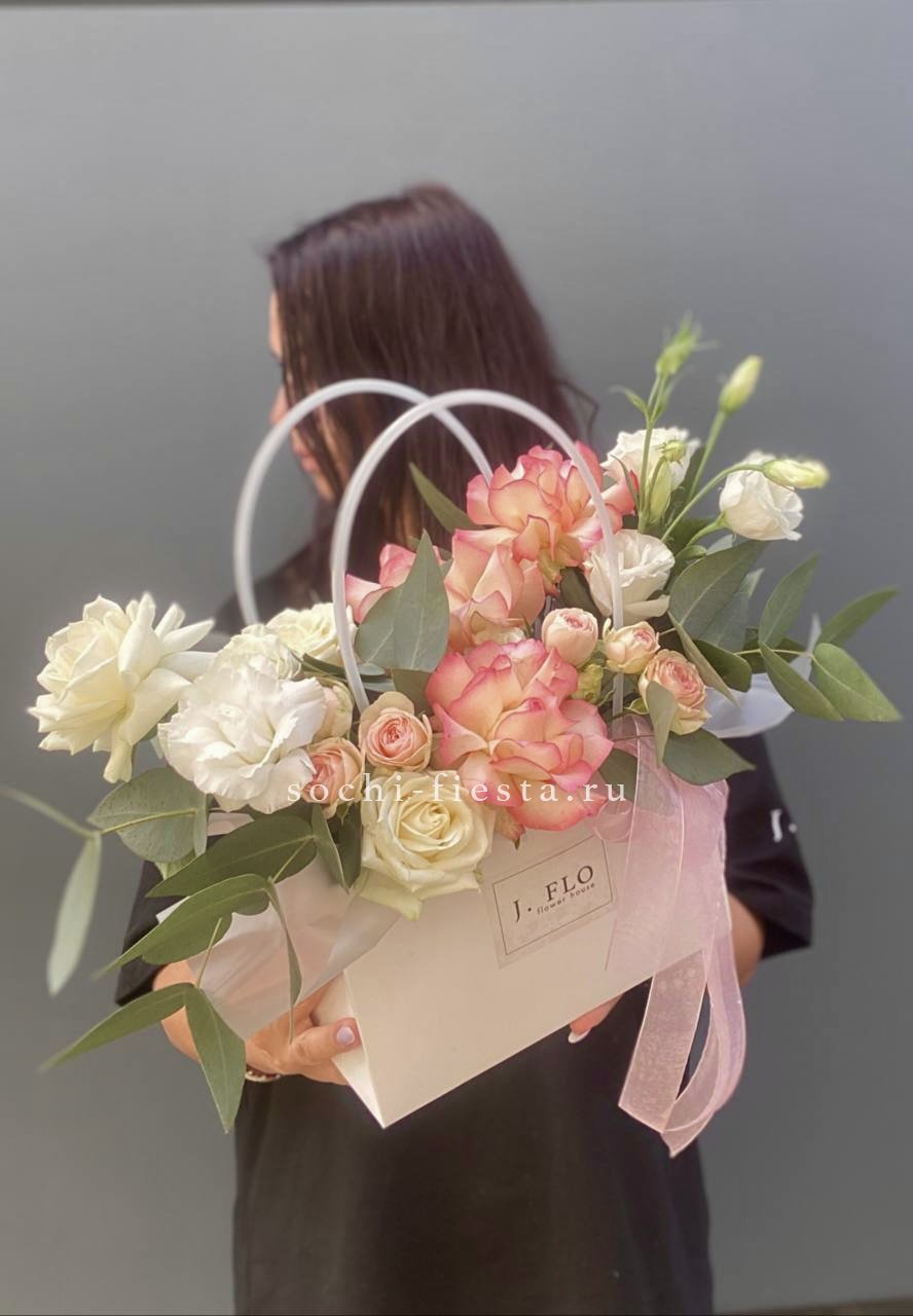 Пышные головки пионовидных роз задают объём, а мелкие соцветия диантуса разбивают плотность. Гортензия добавляет воздушную текстуру, эвкалипт смягчает линии. Композиция в сумке-кашпо выглядит свободно и живо.
