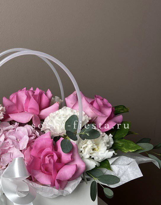 герберы , диантусы, белая роза, маттиола, хризантема кустовая, лента, сумка-кашпо.