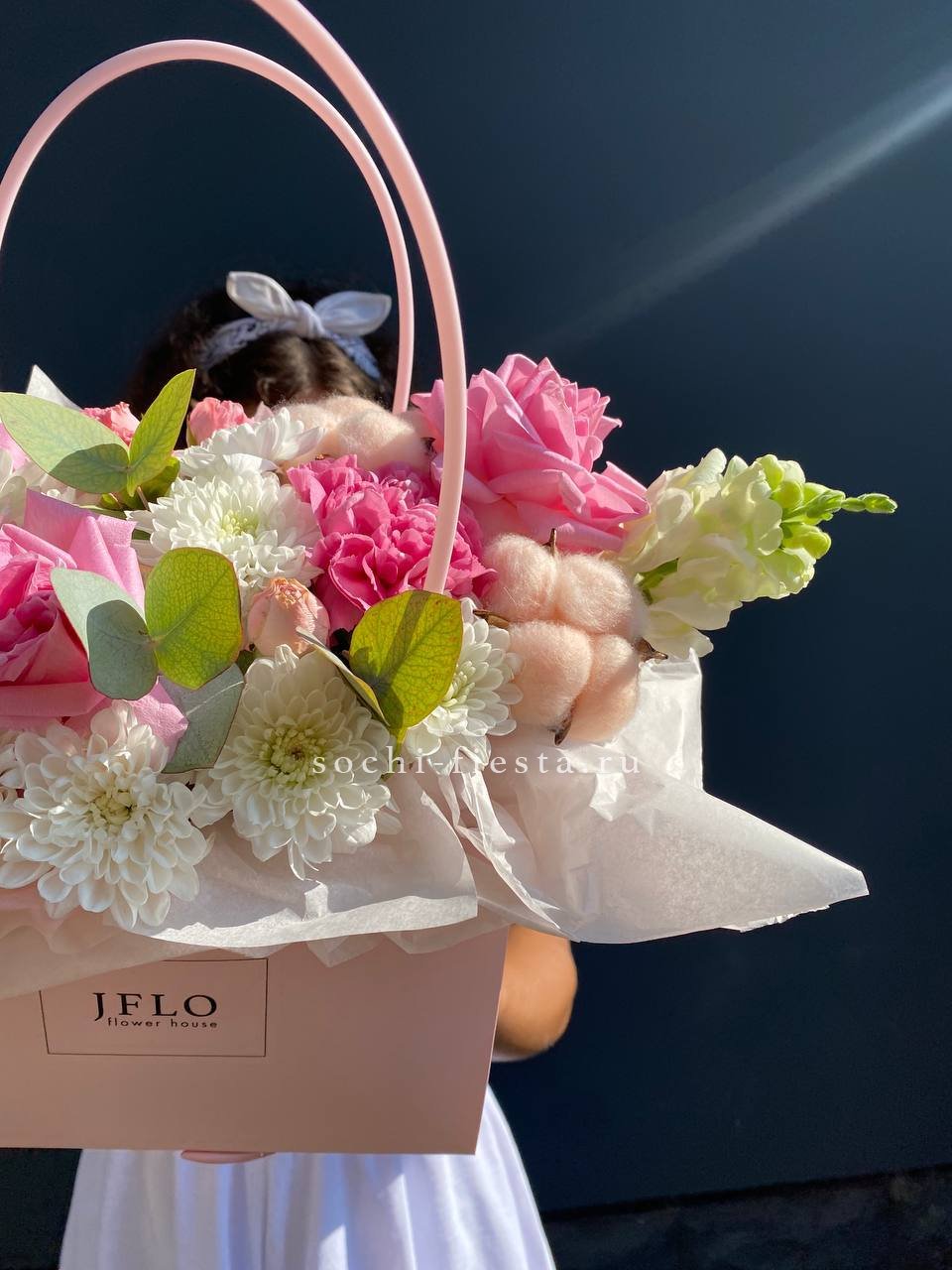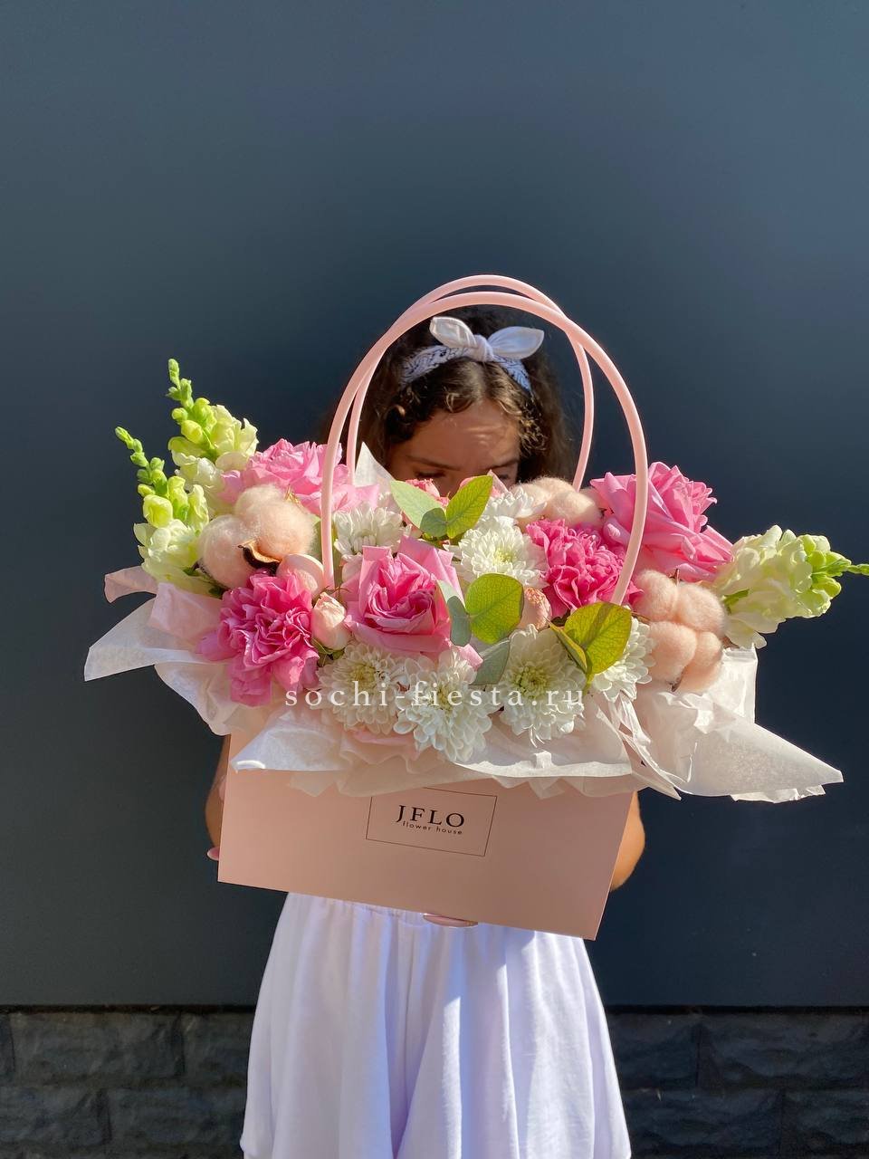 Розовые розы и диантусы переплетаются с кустовыми хризантемами в плотной округлой композиции. Альстромерия добавляет графичные акценты между бутонами. Сумочка собирает все элементы в аккуратную форму с естественным объёмом.