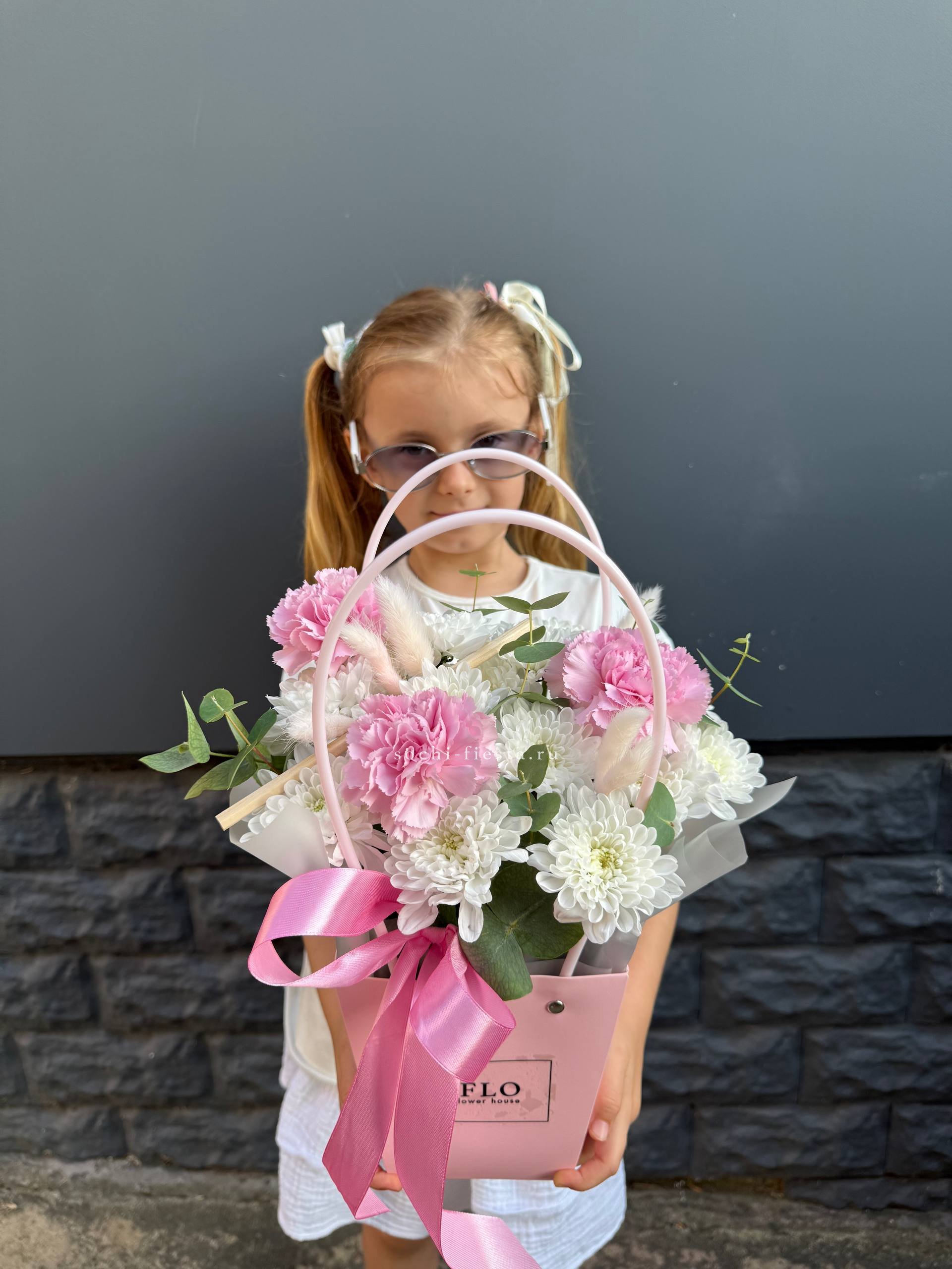 Голубая гортензия и статица задают основной тон, а кустовые розы разбавляют прохладную палитру теплыми нотами. Сумочка держит форму и выглядит собранно.