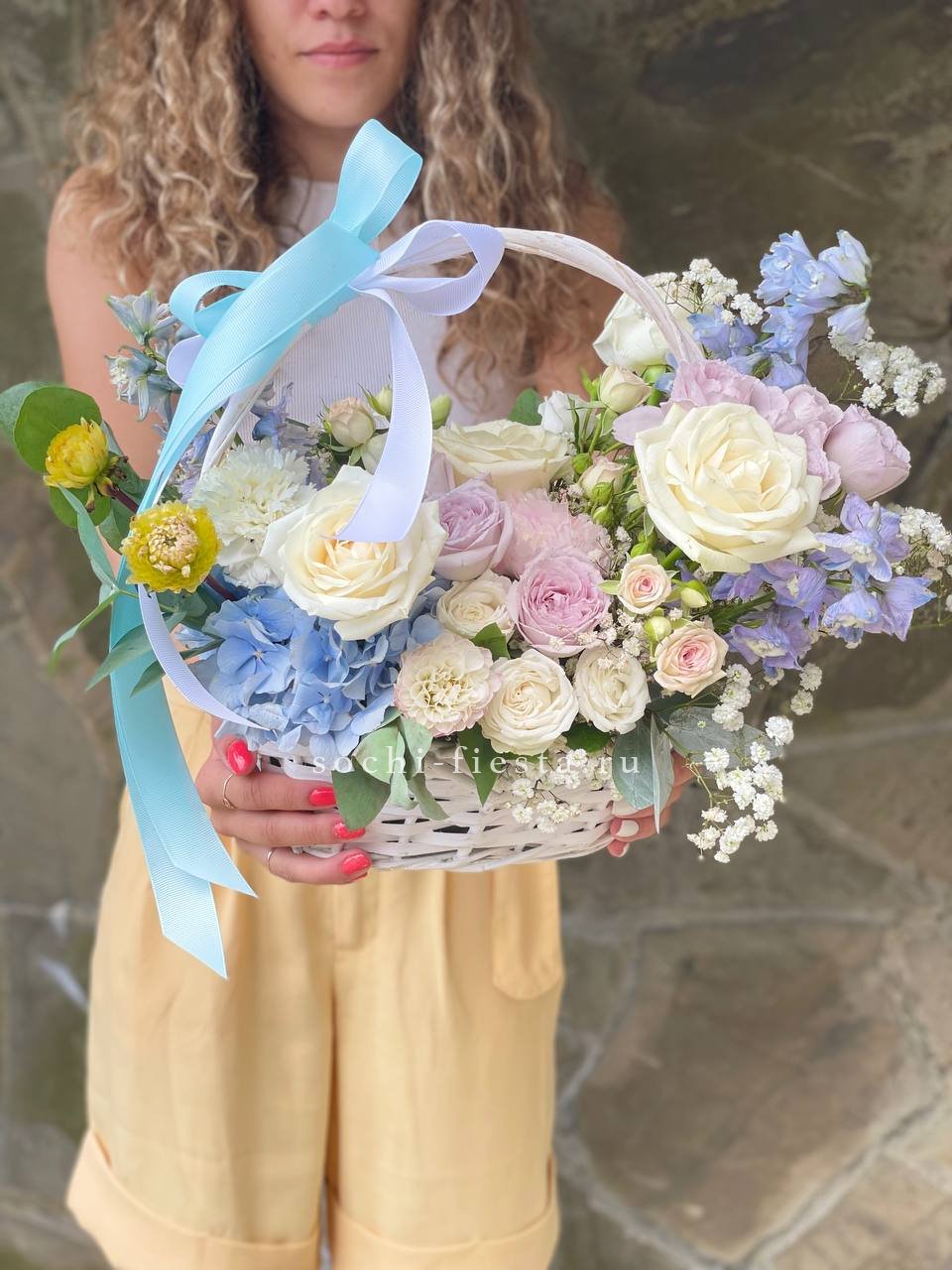 Широкая корзина вмещает пышную композицию из гортензий, эустом и пионовидных роз. Цветы располагаются свободно, создавая впечатление садовой клумбы, перенесенной в интерьер.