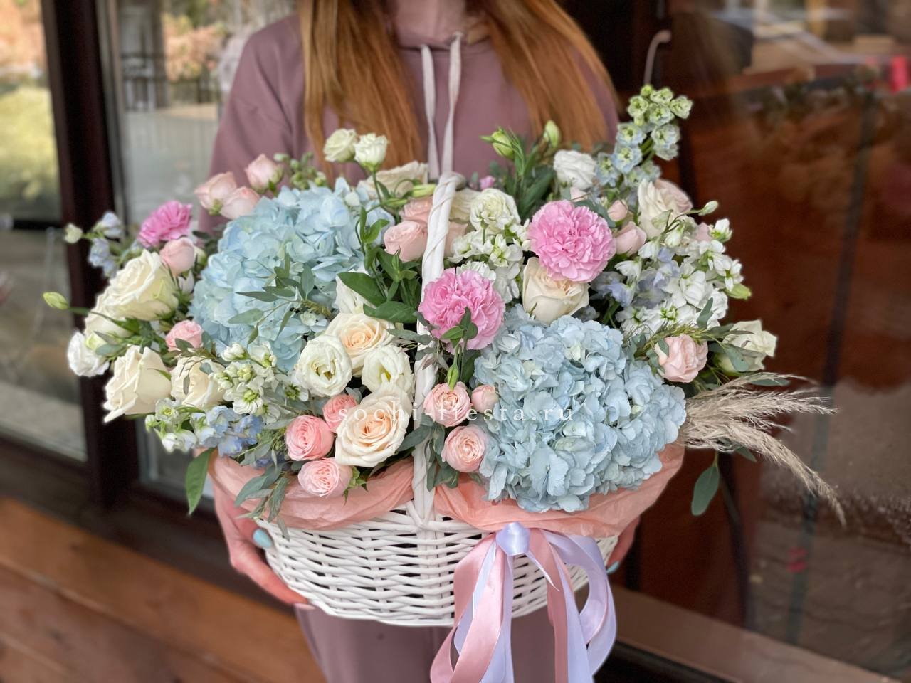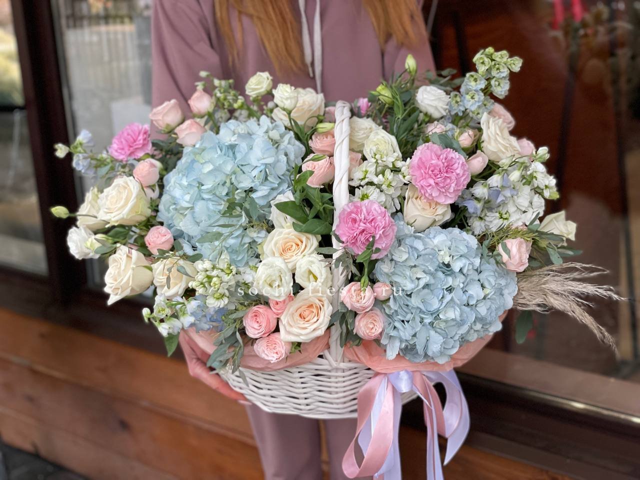 гортензия, эустома, пионовидная кустовая роза, розы одноголовые, диантусы, вспомогательная зелень, лента, корзина D45.