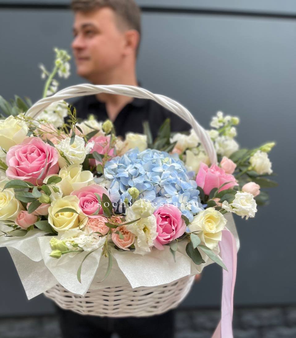 роза  французские - 25шт, эвкалипт, корзина.