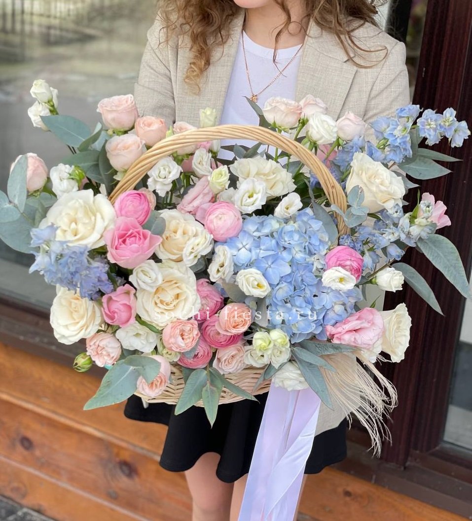 Плотная сферическая форма из пышных бутонов создаёт объёмную композицию в плетёной корзине. Ветки эвкалипта добавляют воздушности между головками цветов. Классическое решение для яркого события или знакового дня в жизни близкого человека.