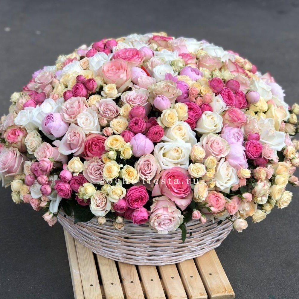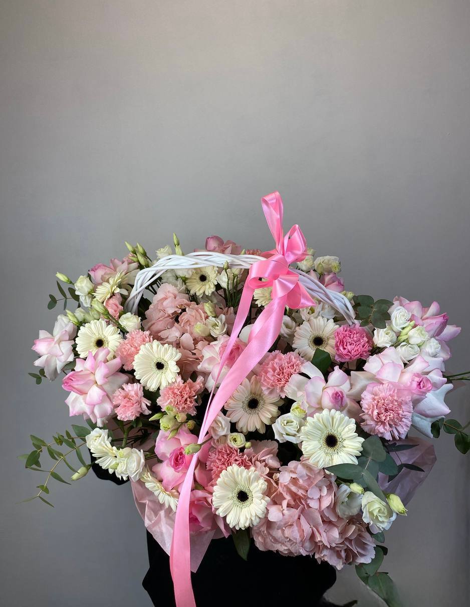 Гортензия и эустома задают объём, а яркие герберы расставляют цветовые акценты по всей композиции. Диантус и хайди добавляют воздушности, эвкалипт завершает силуэт мягкими линиями. Корзина держит форму и создаёт устойчивую основу для пышной композиции.