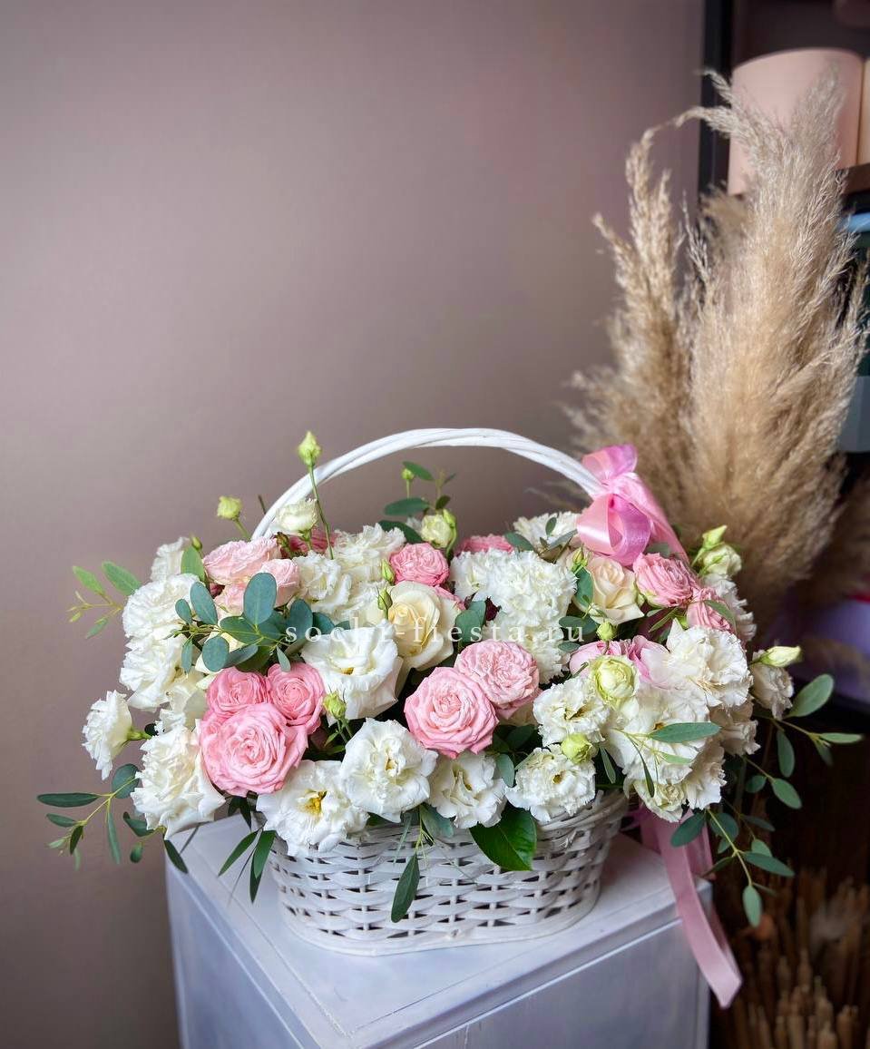 Пышные пионовидные розы Мисти Баблс и бомбастик создают объёмное облако в естественной плетёной корзине. Диантусы и статица добавляют воздушности, а эвкалипт завершает композицию свежими нотами. Яркое присутствие в любом пространстве.