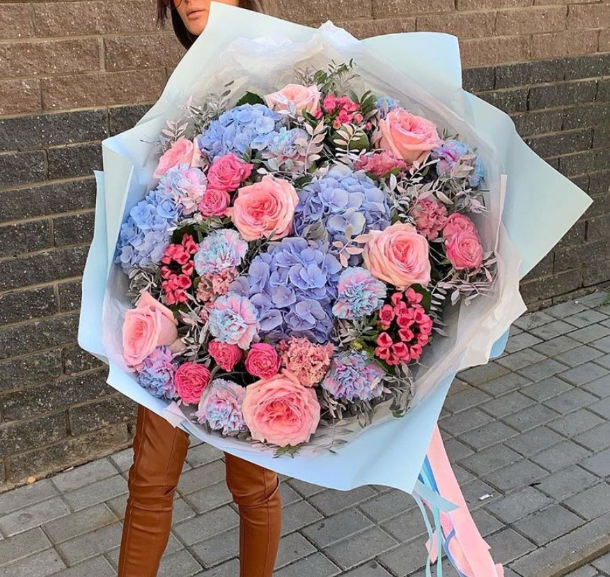 розы, диантусы, пионовидные кустовые розы, гортензия, эвкалипт, вспомогательная зелень, лента, дизайнерская упаковка.
