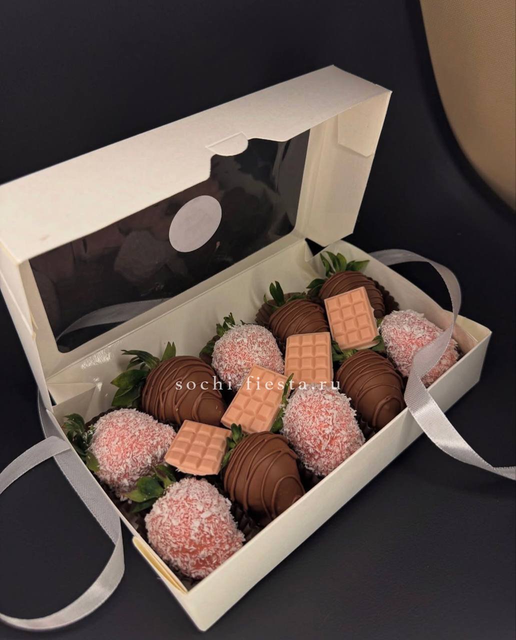 Бельгийский шоколад раскрывается белоснежной глазурью с яркими вкраплениями клубники и орехов. Каждая конфета собрана вручную из натуральных ингредиентов. Миндаль и фисташка добавляют композиции текстурную глубину.