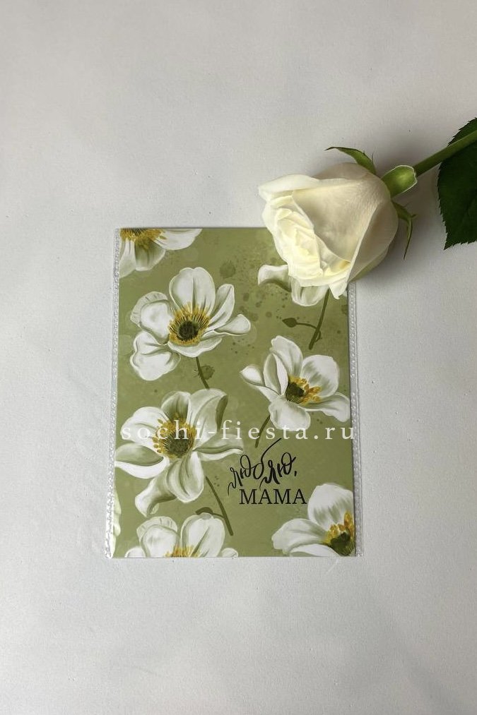 Карточка с лаконичной фразой и белым фоном. Внутри достаточно места для вашего послания из нескольких строк. Завершает композицию и добавляет личные слова к живым цветам.