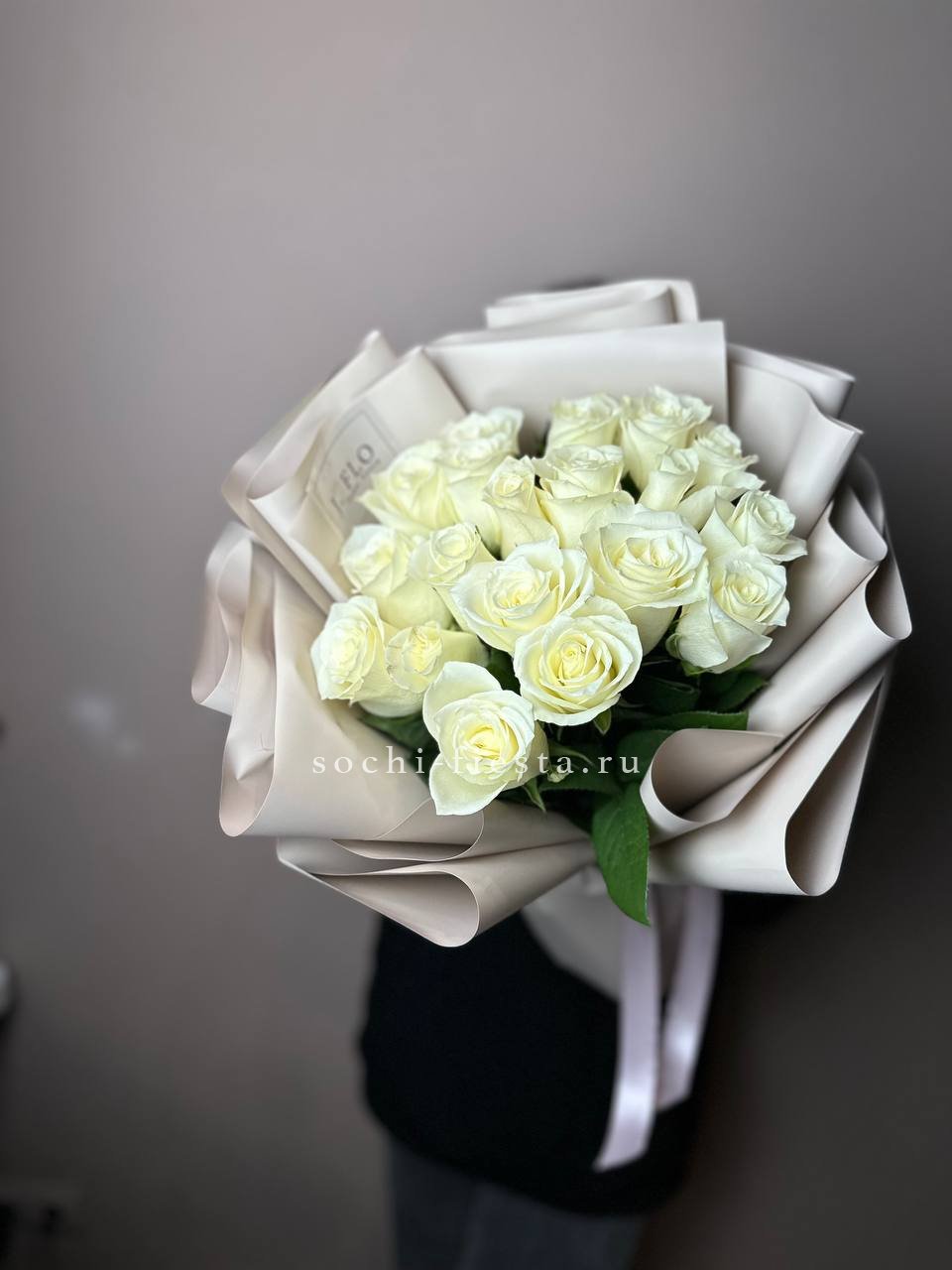 15 белых роз, лента, крафт.