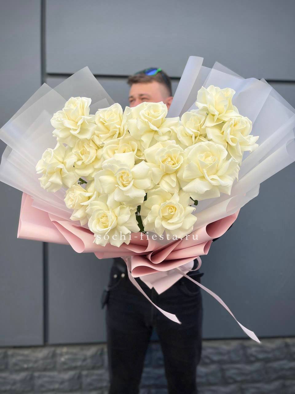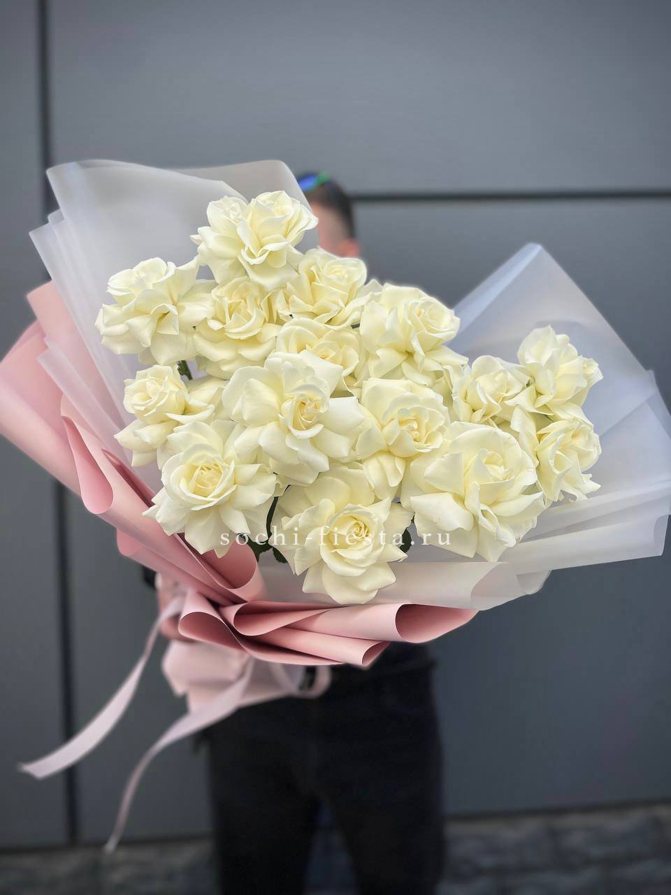 Пятнадцать белых роз собраны в плотный букет с чистыми линиями. Прозрачная упаковка сохраняет свежесть и открывает естественную красоту бутонов.