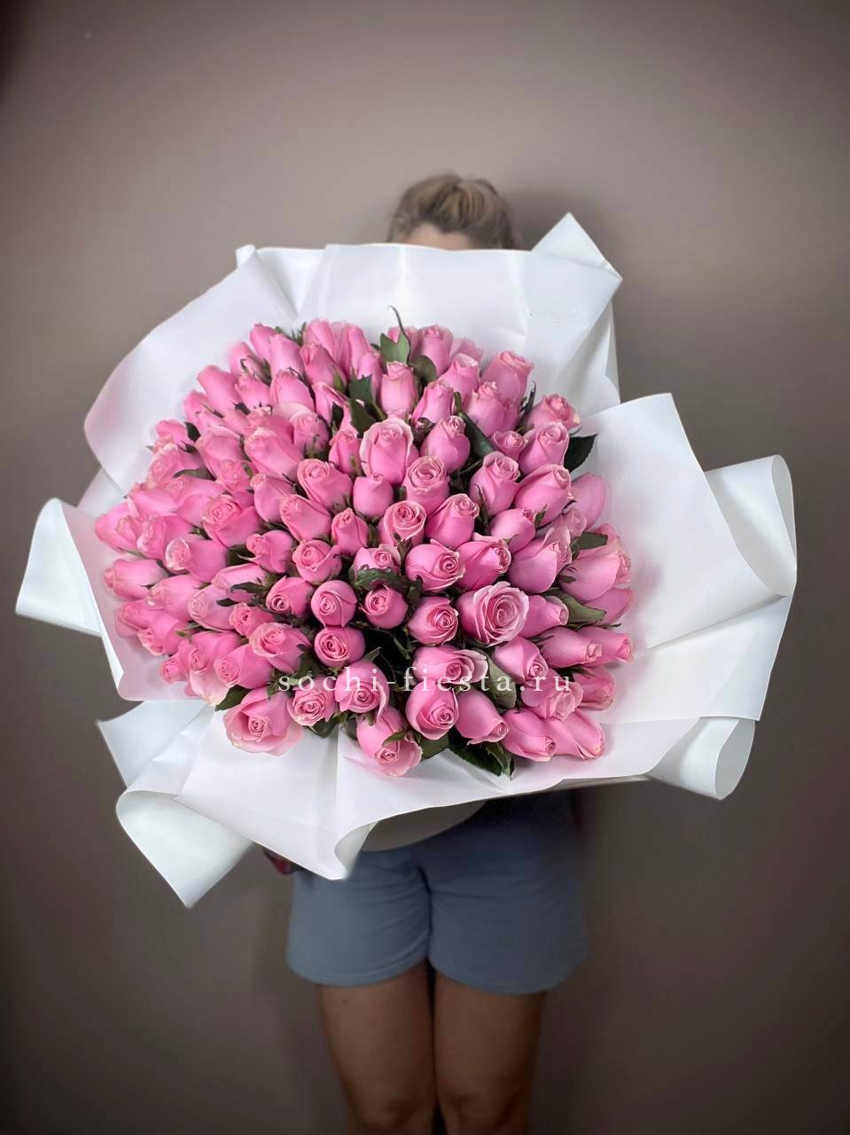 Тридцать пять стеблей формируют объемную композицию в розовой гамме. Букет занимает пространство уверенно и держит форму за счет плотной сборки. Классика, которая работает всегда.